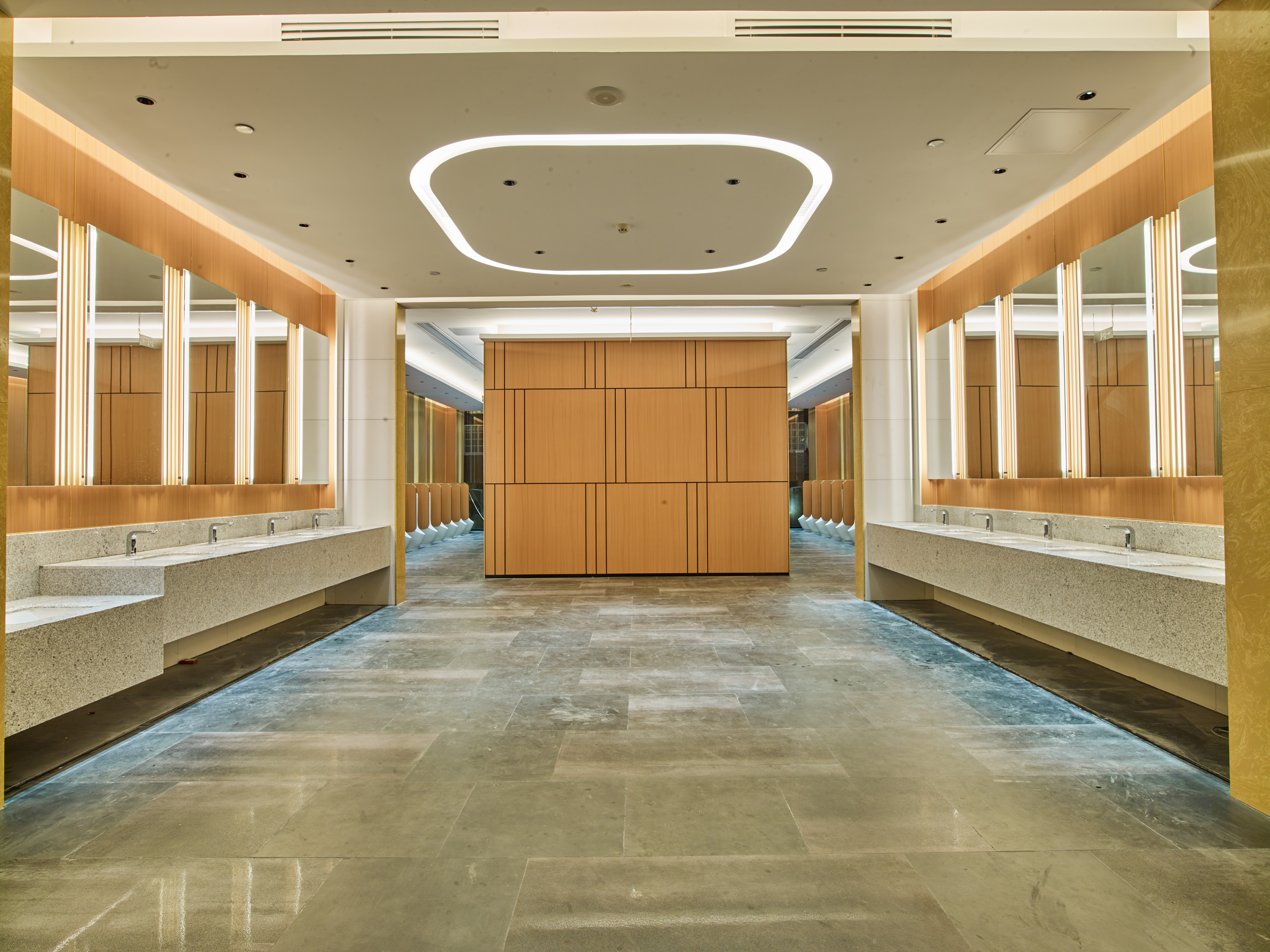 为给司机乘客提供更清洁舒适的环境,梁金山服务区公共卫生间采用中央空调、新风系统、智能感应系统,并在入口处设置当地文化艺术展览橱窗,精心融入本地侨乡建筑传统符号和竹子等自然特色,大大提升了传统卫生间的使用体验。服务区内建设了污水外输管网工程线路约4千米,站区内污水经收集后,将接入市政污水厂处理,实现了服务区建设与生态环保的可持续发展。