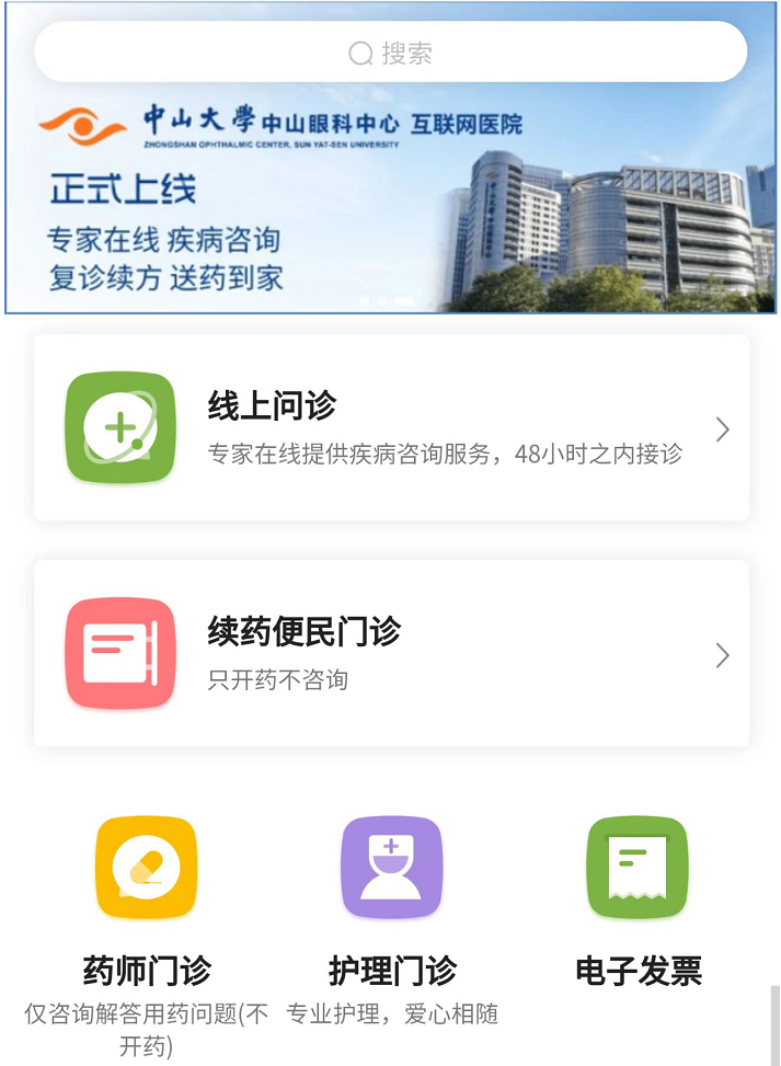 ①微信扫码下载【中山眼科中心】APP,根据提示进行安装后点击【互联网医院】图标进入;
