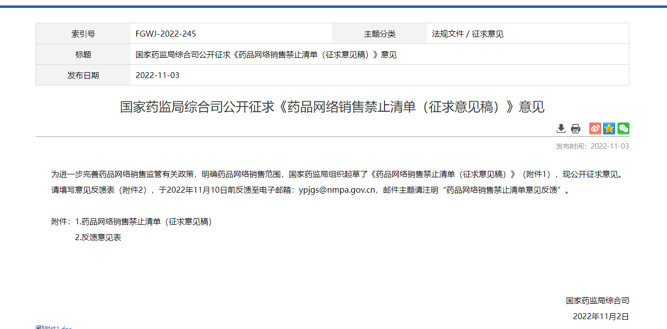 而就在近期,国家药监局网站发布公开征求《药品网络销售禁止清单(征求意见稿)》意见,意见反馈截止时间为2022年11月10日。