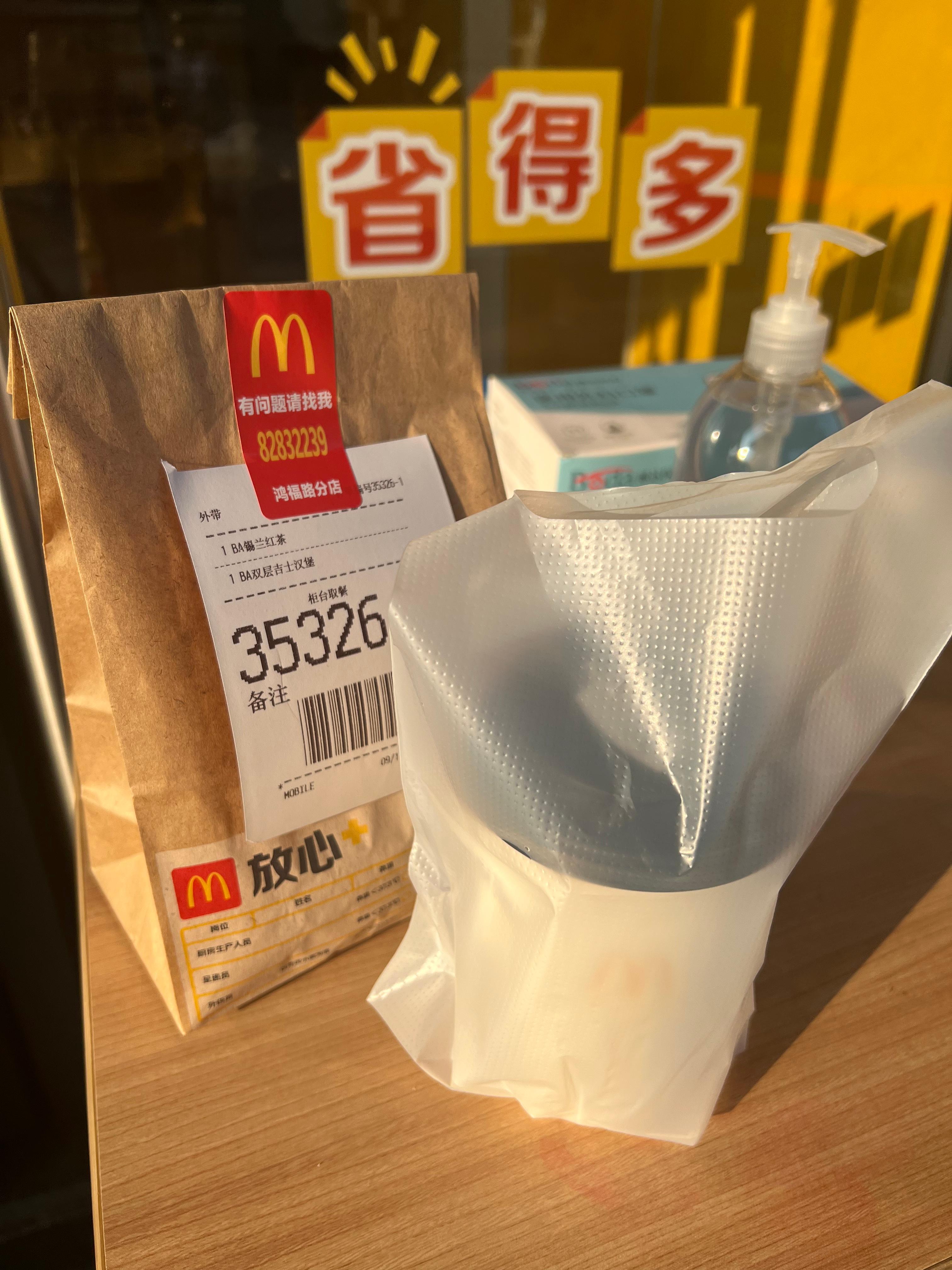 将近晚餐时间,社区餐饮门前渐渐多了一些等候打包外带食品的食客以及等候取餐的外卖骑手。在麦当劳大门前,一长串的“通知”拦住了入店之人,要求食客扫码才能入店取外卖。门口有专人守着,提醒食客扫码。门前还专门放置了一张桌子,提供免洗消毒液和一次性口罩,供出入的顾客使用。记者下单了一份麦当劳餐饮,1分钟内迅速进入“配餐中”状态,2分钟后,便进入“待取餐”环节。提示餐品已完成,随时可取。