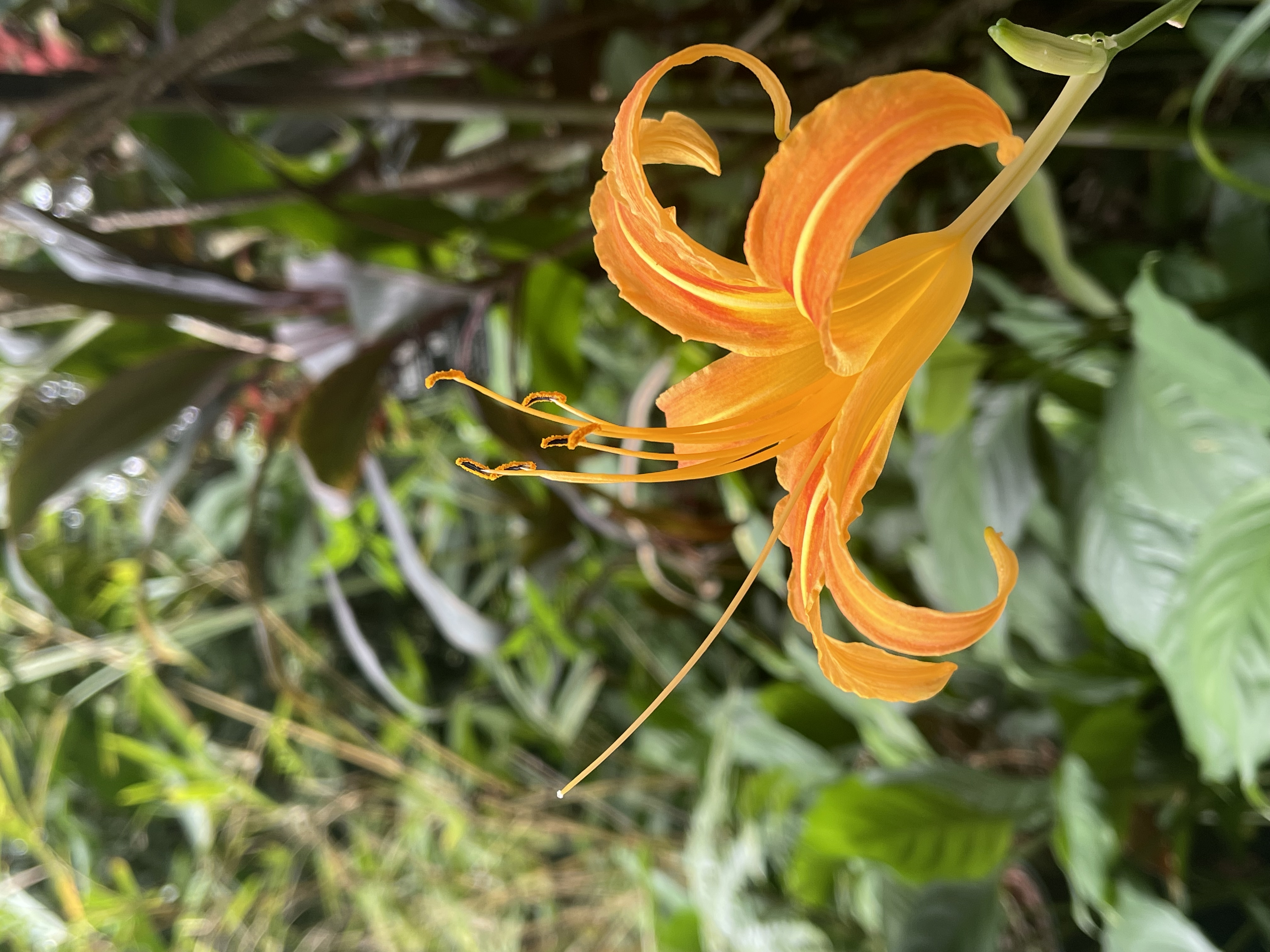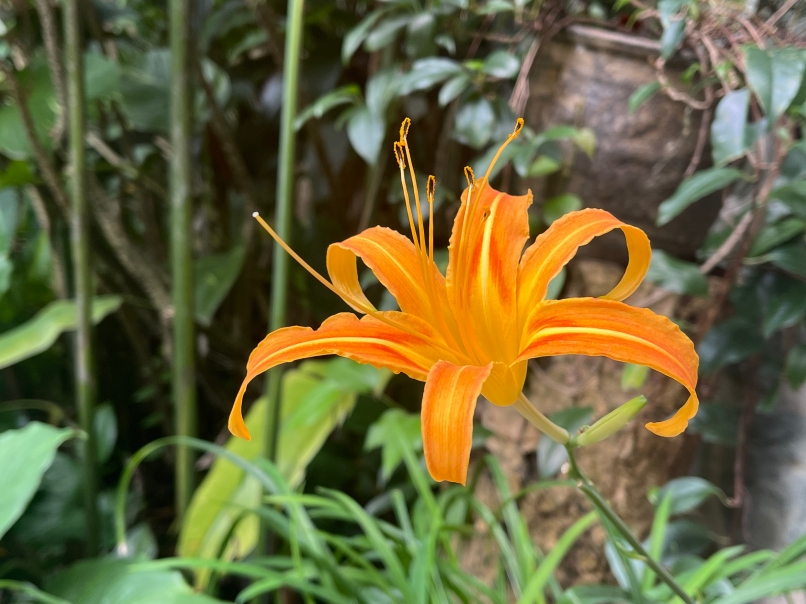 萱草虽微花,孤秀能自拔。虽然时节慢慢步入秋冬,近日在华南国家植物园药园里,依然可以偶遇萱草花的身影,花茎自叶丛抽出,枝顶生花。在一片绿植中,橘黄色的萱草花甚为夺目,长长的雄蕊傲然突出花被外,更添婀娜之姿。日出而开,日落而谢,每一天的萱草花都是新的,再有幸遇见也仅是一面之缘。