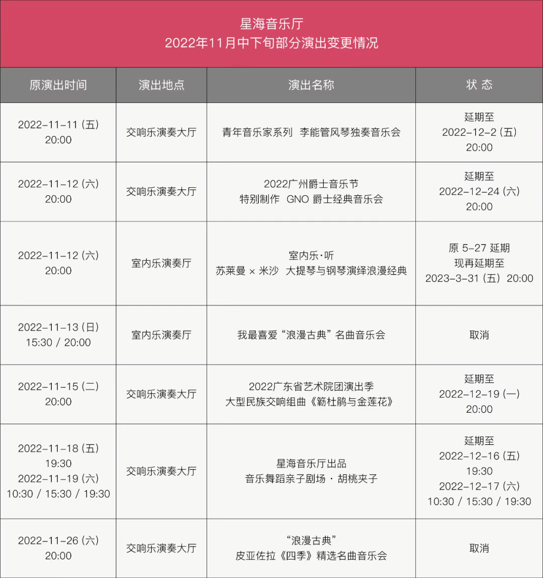 通知称,根据广州市政府新闻办11月8日举行的广州市疫情防控新闻发布会,广州疫情形势依然严峻复杂。为配合属地防疫部署要求,星海音乐厅全力以赴,与艺术家和乐团等多方反复沟通,为近期的延期演出进行重新定档,期待在不久的将来能与观众们相见。