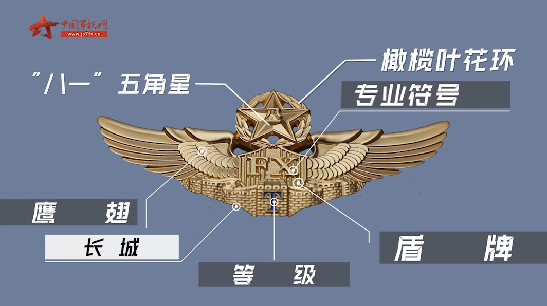 飞行等级证章为金属锻金,由“八一”五角星、橄榄叶花环、鹰翅、盾牌、长城、等级和专业符号组成。
