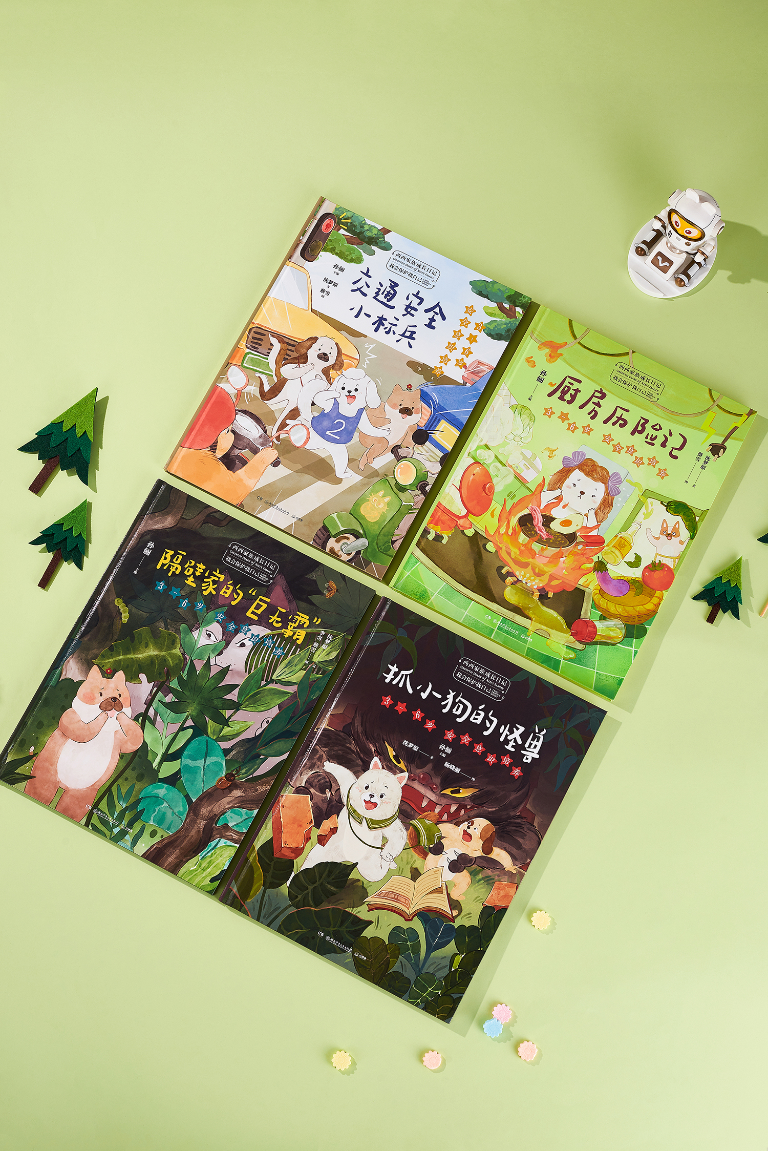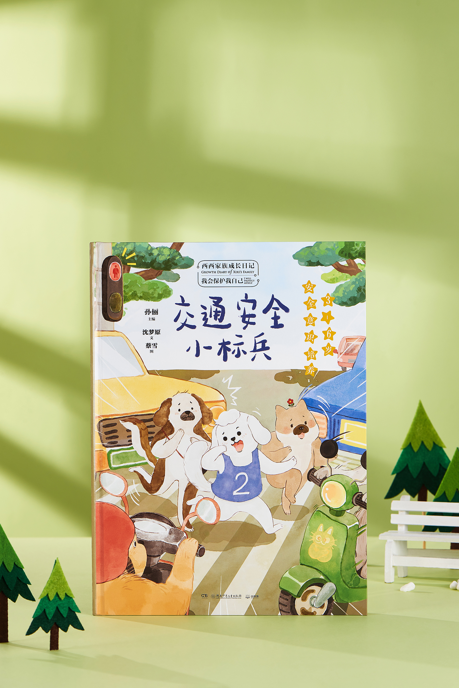首先推出的系列——《西西家族成长日记·我会保护我自己》分为四册,每册一个故事。从孩子最熟悉的生活场景入手,结合西西家族小狗们的生活日常,一个故事对应一个安全问题,譬如在《交通安全小标兵》里,孩子们可以通过二哥闹闹西过马路时乱跑造成车祸的噩梦,明白过马路要遵守交通规则的道理;