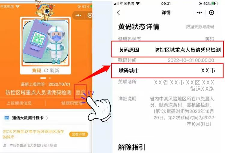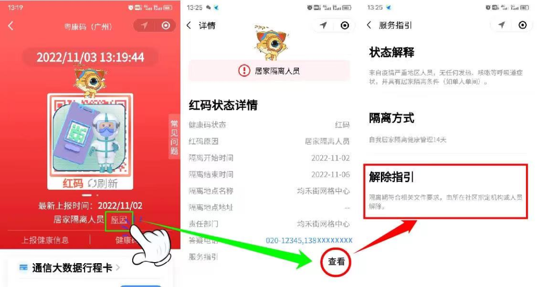 如何解除红码?具体解除指引可通过“穗康”小程序,进入“我的健康码”,选择“原因”查看解除指引,如下图所示。