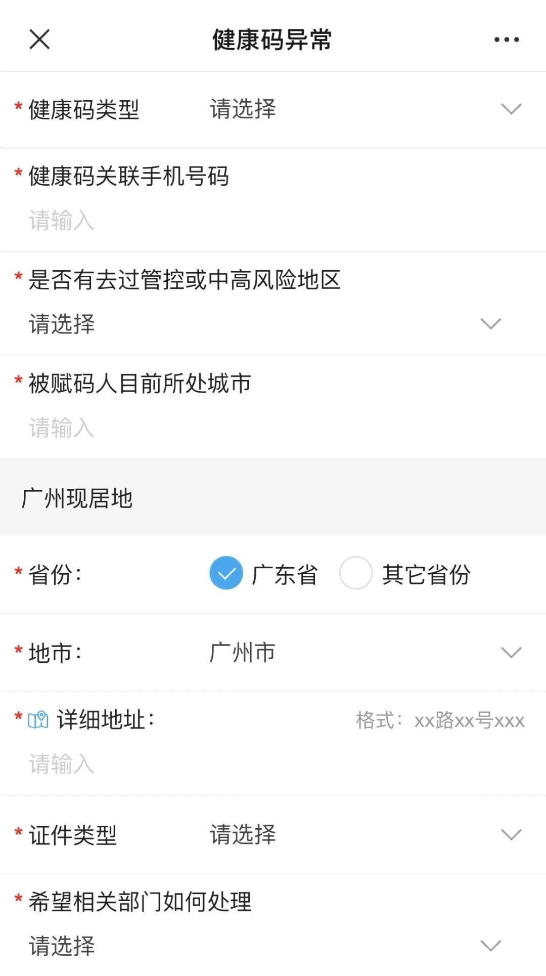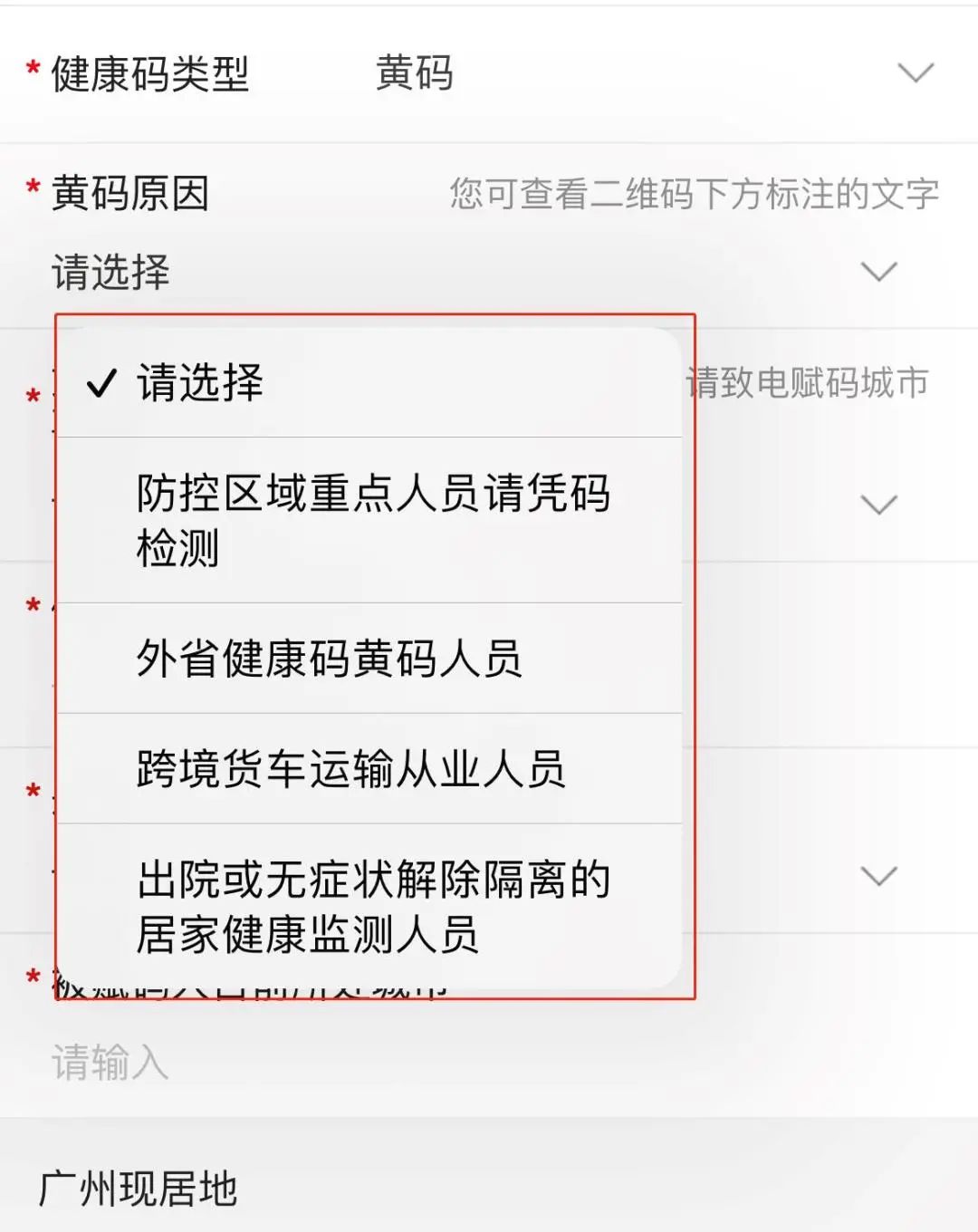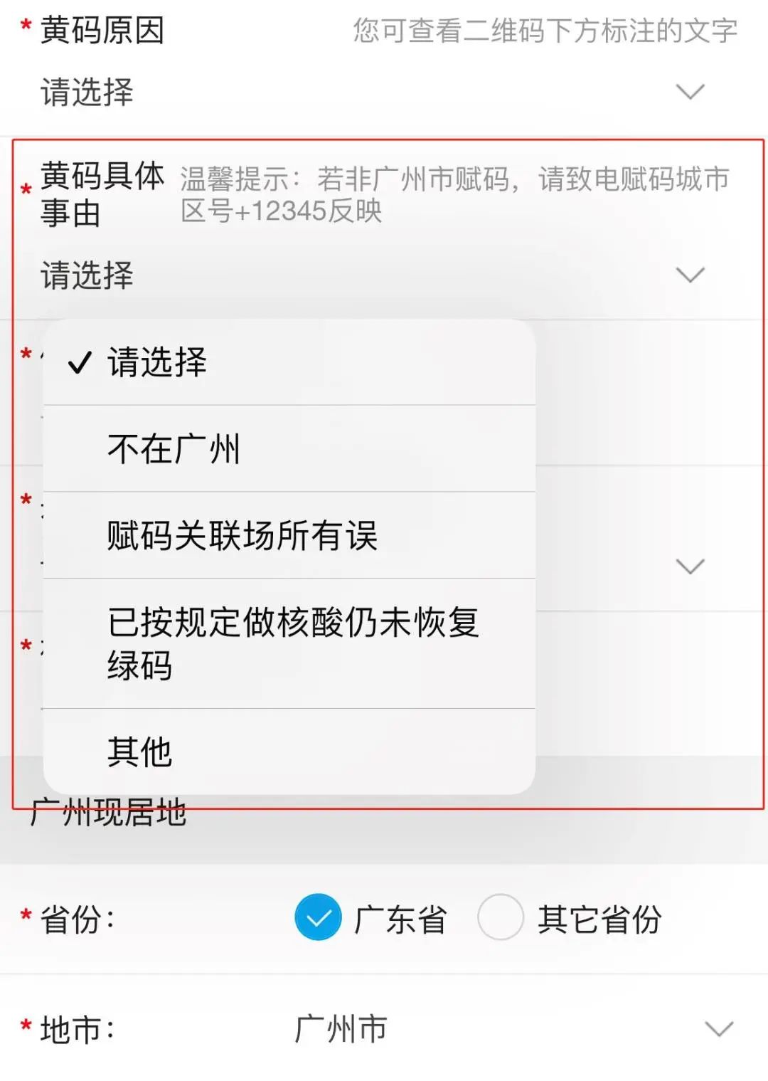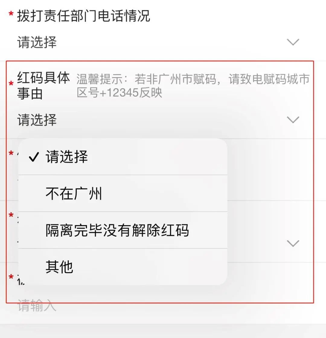 2、关于具体事由:需如实并准确选择个人情况,例如:不在广州、隔离完毕没有解除红码、已按规定做核酸仍未恢复绿码。