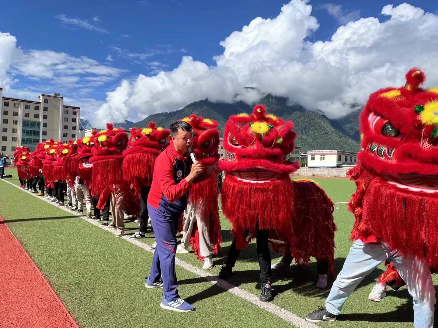 龚桂东和李东彪都是土生土长的广东人,来到海拔3000米的林芝,缺氧的感觉随之而来,但是他们没有作更多的休整就立即投入到教学工作中。他们分工合作,每天带领学生在操场上学习训练,一招一式地分解演示,一个一个动作反复纠正练习,就算被高原紫外线照射到皮肤干裂也没有任何怨言。学生们也学得特别认真,扎马步、跑、跳、举、落,每个起承转合都练得非常卖力,没几天工夫,眨着大眼睛欢快跳跃的狮子和上下翻飞腾挪盘旋的彩龙就已经活灵活现地出现在舞台上了。这些精彩的瞬间,被梁伟明副台长通过镜头记录下来。