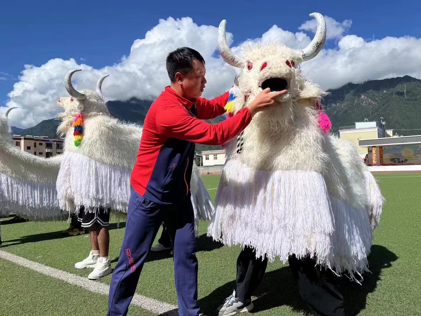 金玲他们一行还包括根据广州市非遗中心的安排,到林芝指导学生学习醒狮和舞龙表演的广州市龙狮协会两位传承人龚桂东和李东彪。他们因地制宜地将龙狮与牦牛舞的表演结合起来,新意满满。