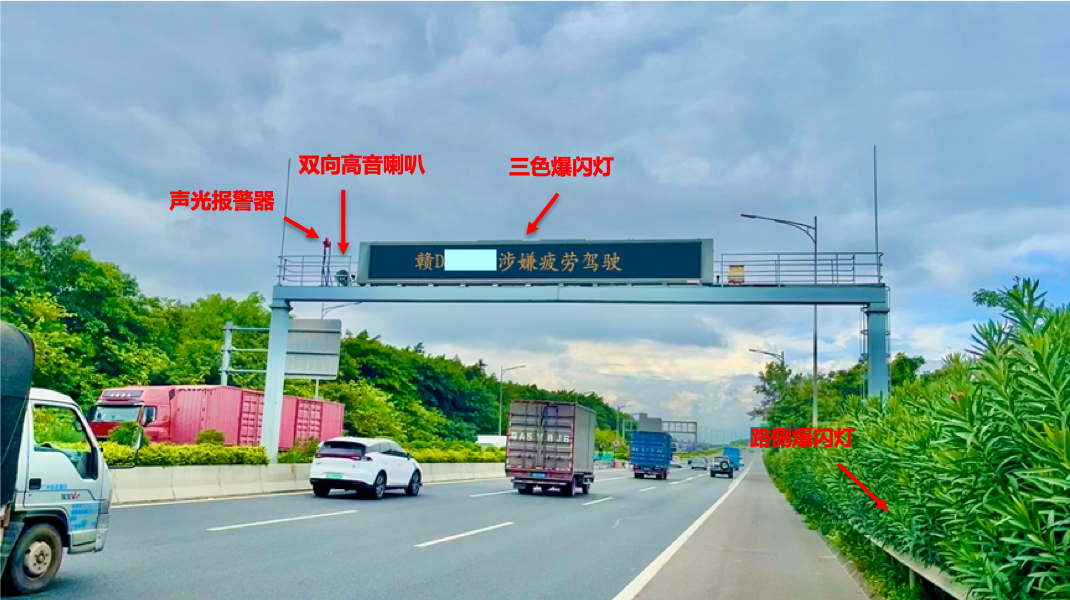 据介绍,快速交通选取机场高速“花山-东湖”段为试点,将收费系统ETC门架和监控系统情报板门架分别作为数据分析点和信息发布点,在门架之间的道路两侧及情报板上方安装爆闪灯、双向高音喇叭以及声光警报器,通过文字、声音、灯光发布三重警示提醒,实现视听融合触达,提示疲劳驾驶的车辆从就近的出口驶离高速休息。