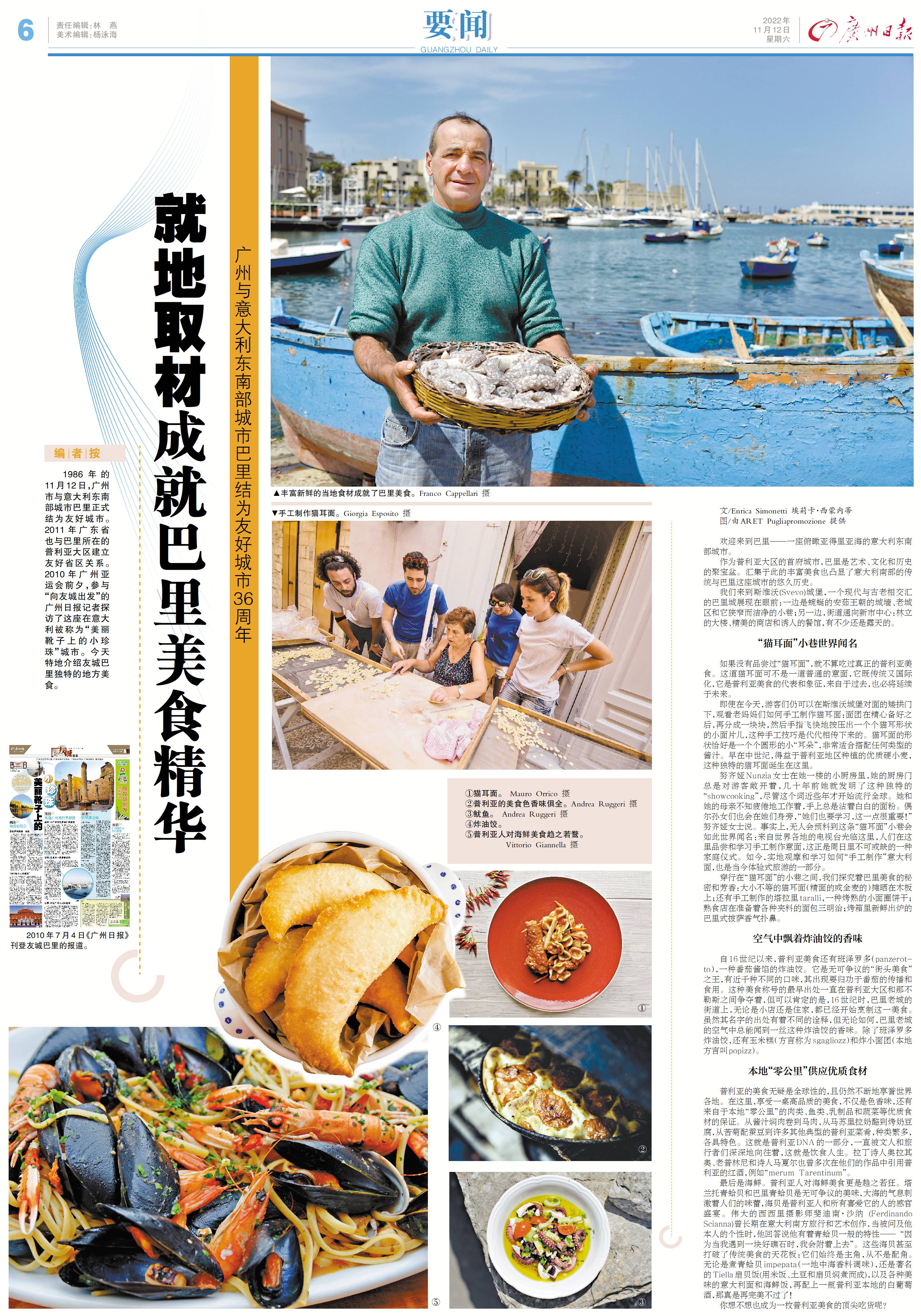 编者按:1986年的11月12日,广州市与意大利东南部城市巴里正式结为友好城市。2011年广东省也与巴里所在的普利亚大区建立友好省区关系。2010年广州亚运会前夕,参与“向友城出发”的广州日报记者探访了这座在意大利被称为“美丽靴子上的小珍珠”城市。今天特地介绍友城巴里独特的地方美食。