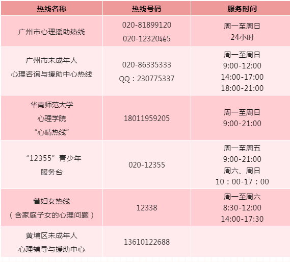 除此之外,广大市民也可以拨打24小时心理援助热线020-81899120 或 020-12320-5,为市民提供免费心理咨询服务。