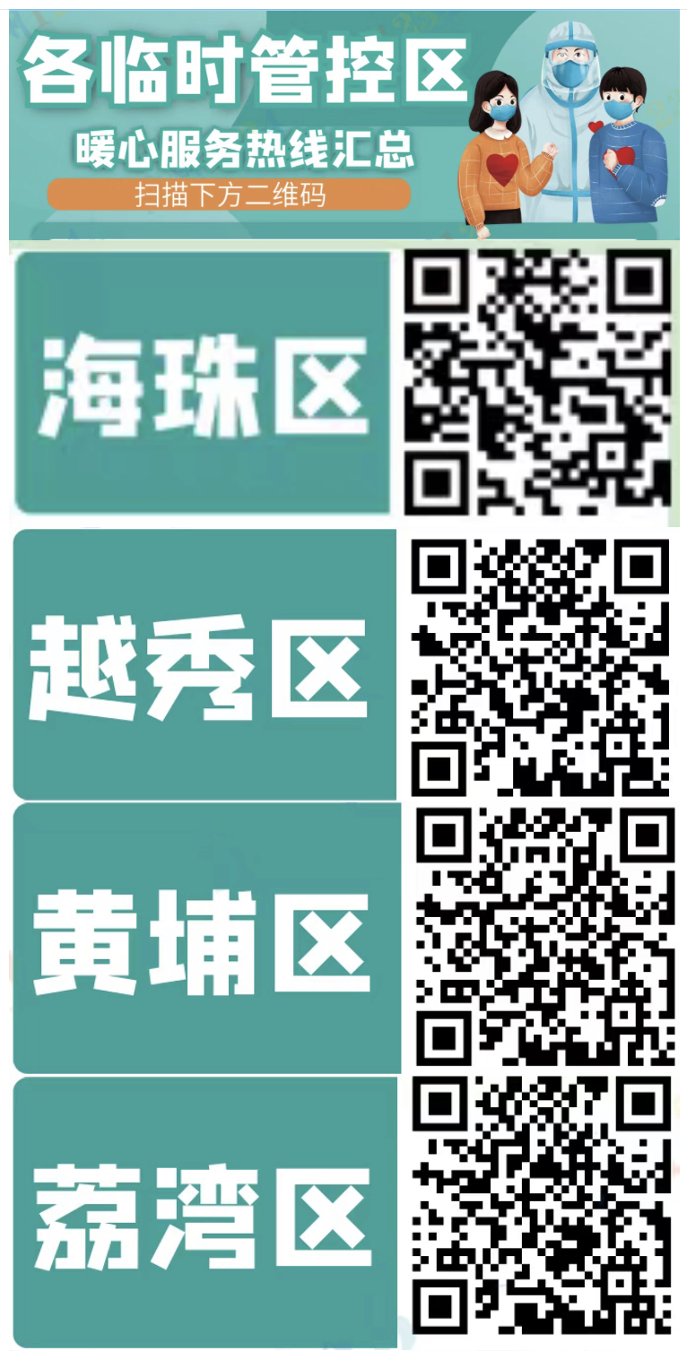 若遇到突如其来被临时管控划为风险区。先别慌!如遇生活、就医等困难,可拨打各区暖心服务热线。各个管控区市民也点击扫描下方二维码,查看各区服务热线。