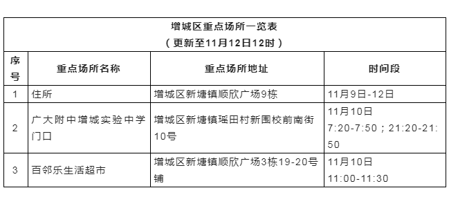 11月12日,增城区在外区返增重点人员核酸检测中发现1名核酸检测异常人员。因疫情防控需要,请有以下时空交集的市民,立即向所在社区(村)报备,自觉开展“三天三检”自我健康监测,在24小时内主动到就近核酸检测点检测,并做好健康管理,落实个人防护措施。重点场所名单见下表,后续将按实际情况更新。