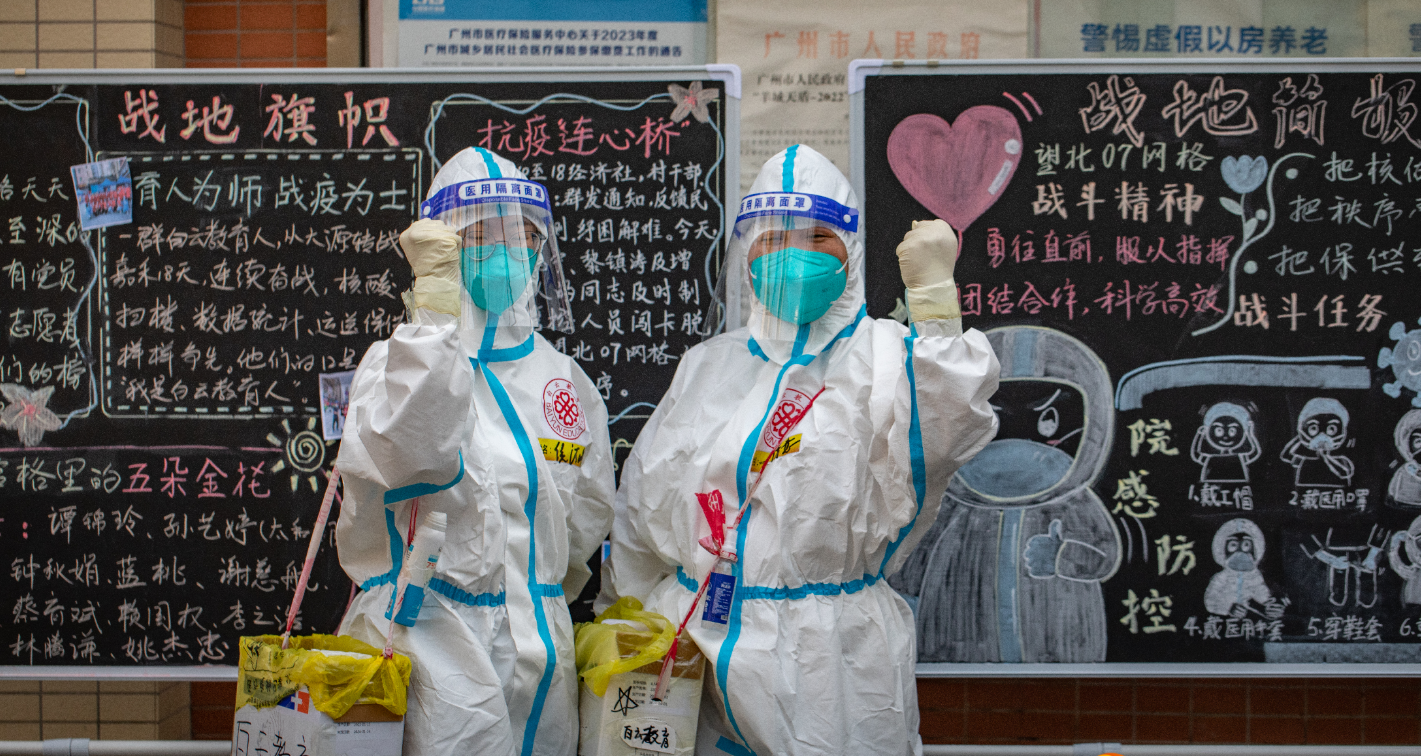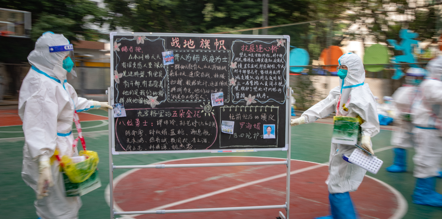 “育人为师,战疫为士。一群白云教育人,从大源转战嘉禾18天,连续奋战……”“把核酸做透,把秩序管好,把保供做到位。”在管控区现场,“防疫简报”图文并茂地展现了来自各单位的抗疫心得,通过卡通人物形象展现院感防控步骤,是一幅主题鲜明、内容丰富、形式新颖的黑板报作品。
