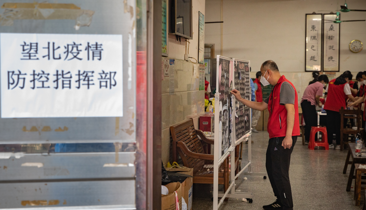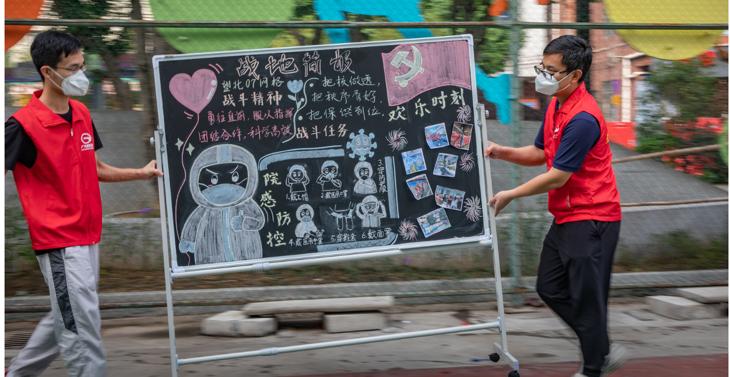 图:防疫工作人员将“简报”移至户外,为大家打气加油
