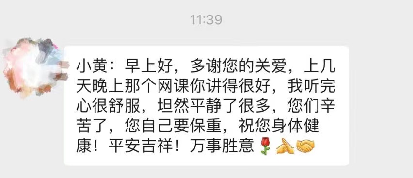 听到社工的问候,服务对象凌姐(化名)说:“感谢关心!个人做好防范,相信疫情很快就会平稳的。我们所有人都要注意休息,保重身体。”