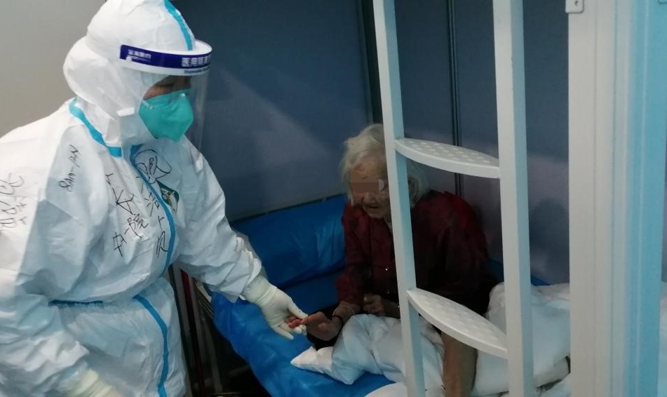 冯洁贞护士长细心地将老人家安置在上层床位的下铺,她的四个亲人也被安排在附近床位,以便就近照顾。接诊的中山一院心内科医生刘岗立即对老人家进行了全面的风险评估,包括高血压、冠心病、糖尿病等老年常见病评估。结果显示,这位老人除了感染新冠病毒外,还有低血糖,但她的身体状况整体尚可。医护人员决定对这位老人予以密切观察和特别关注。