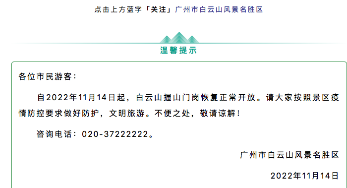 记者从广州市白云山风景名胜区了解到,自2022年11月14日起,白云山握山门岗恢复正常开放。同时,从11月14日起进入白云山麓湖公园聚芳园和星海园须扫场所码、测量体温、查验健康码和24小时内核酸检测阴性证明;星海园内冼星海纪念馆暂停开放。以上措施将根据疫情防控形势变化适时调整。详情请关注广州市白云山风景名胜区订阅号、白云山风景名胜区服务号和微博。