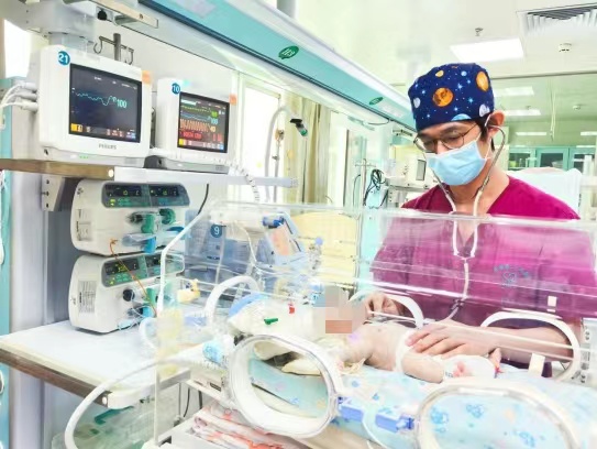 新生儿气管插管、呼吸机辅助呼吸、气管内注入肺表面物质、脐动静脉置入,一系列抢救措施在梁振宇的手中有条不紊地开展。“入院时,两个双胞胎体重仅仅1千克,我觉得我们必须马上采取措施!”