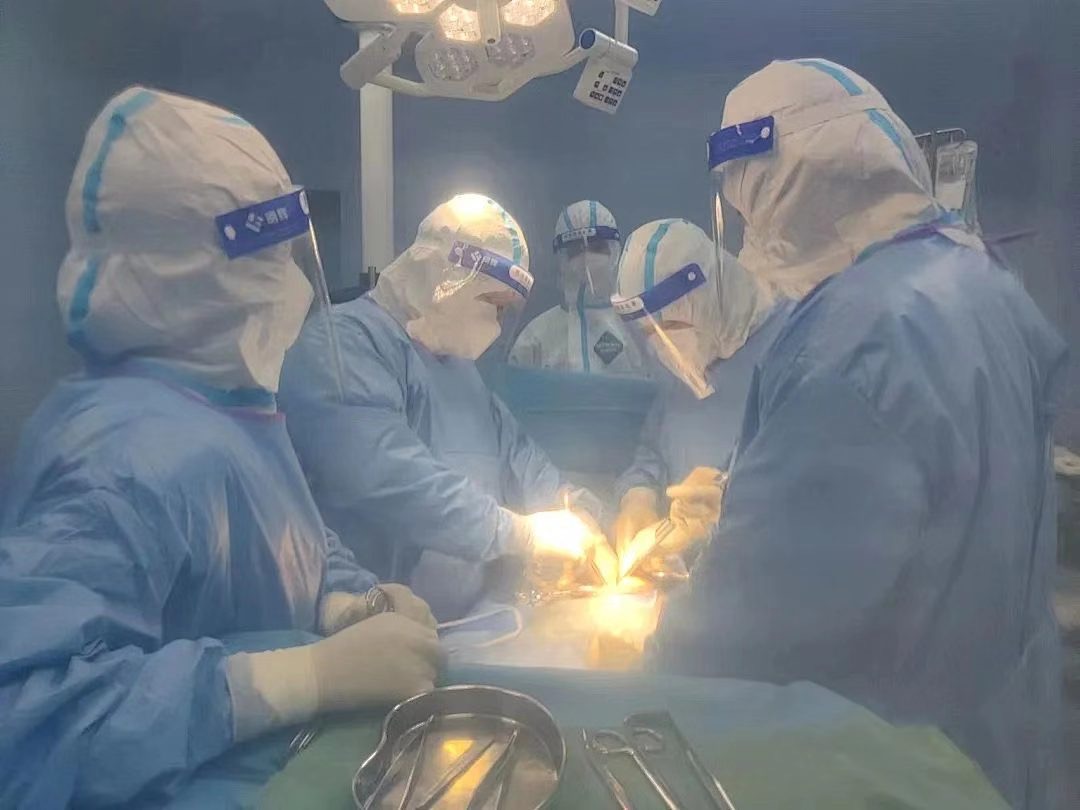 手术室接通知后马上启动负压手术间,准备手术需要的设备、物品,安排了室内室外2组人员无缝对接。隔离病区医务人员经专用通道把黄先生送进负压手术间,外科谭军主任带领手术团队做好防护后进入手术间实施手术。