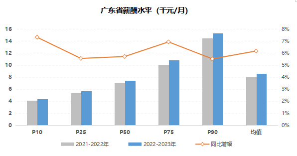 《报告》显示,广东省2022—2023年的平均薪酬为8.6千元/月,同比增长6.17%,与上年增速4.39%相比增长1.78个百分点。从薪酬水平分布来看,平均值是P50值(中等水平)的1.16倍,与上年保持一致;P90值(极高水平)是P10值(极低水平)的3.48倍,与上年3.51倍基本保持一致。从数据来看,广东省低收入群体薪酬增长更加明显,高收入群体增长稳中放缓。
