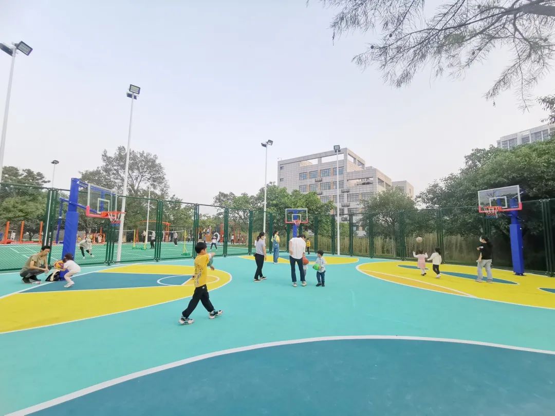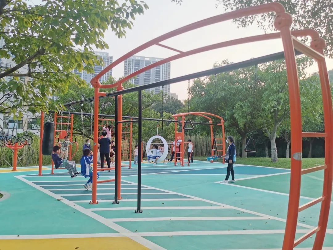 记者在现场看到,圆形的儿童篮球场动感与童趣十足,七彩的塑胶场地舒适又好看,各式健身器材和运动廊架小而精。记者留意到,园内除了人性化提供直饮水,儿童乐园附近还新增划定了停车位。不少孩子在刚刚开放的园内荡秋千、练单杠,还有不少亲子正共同打篮球和羽毛球,现场充满了运动酣畅的欢笑声。