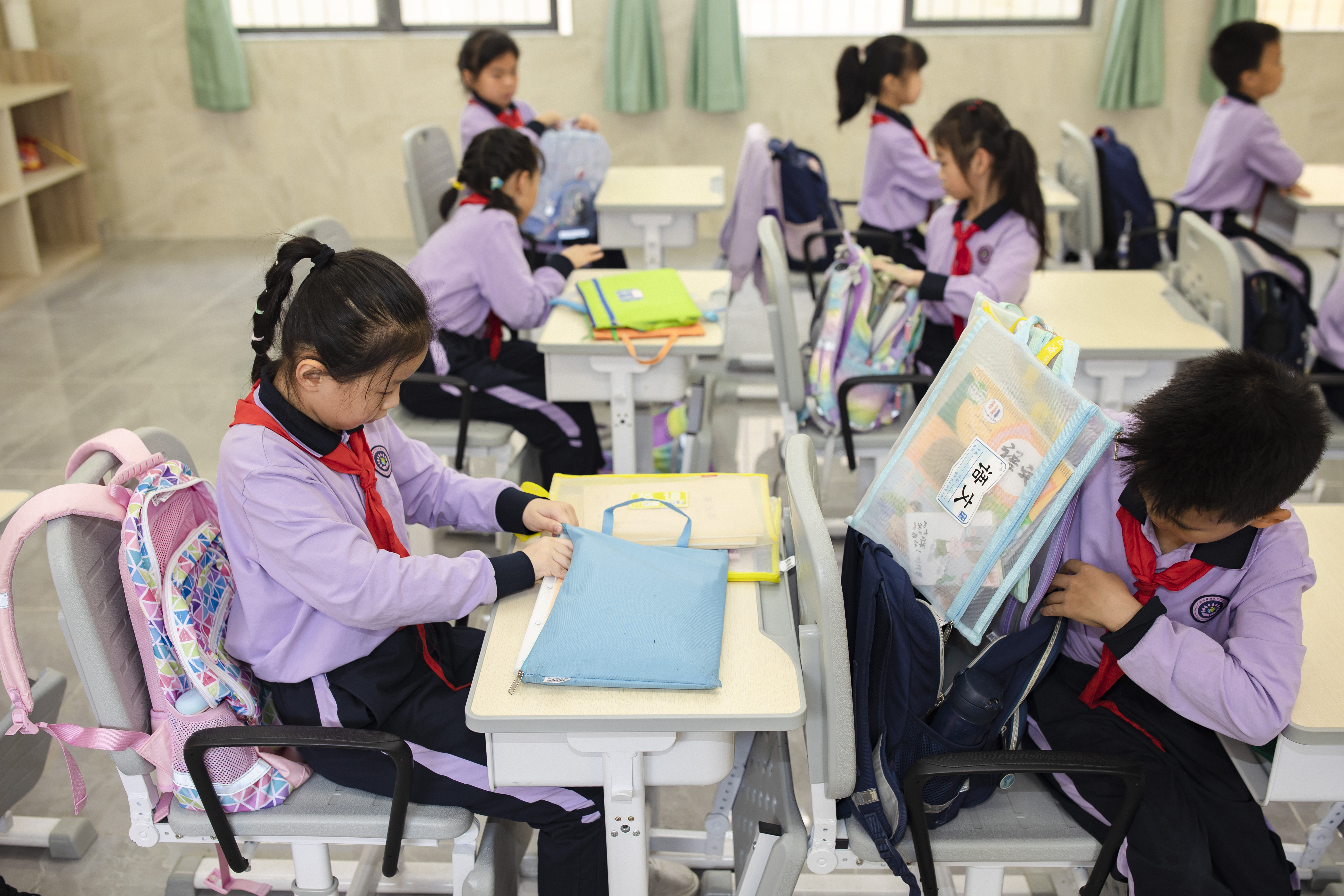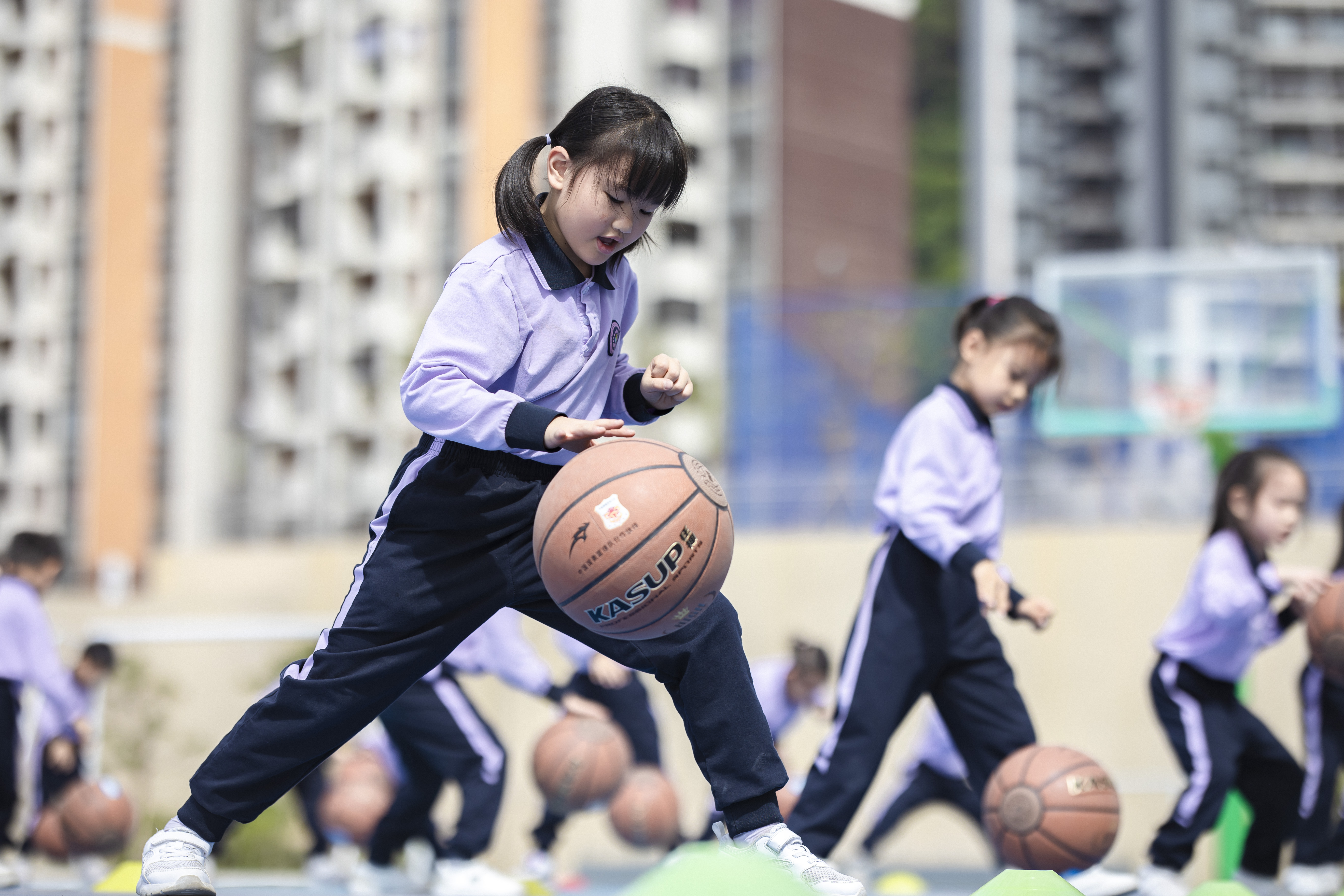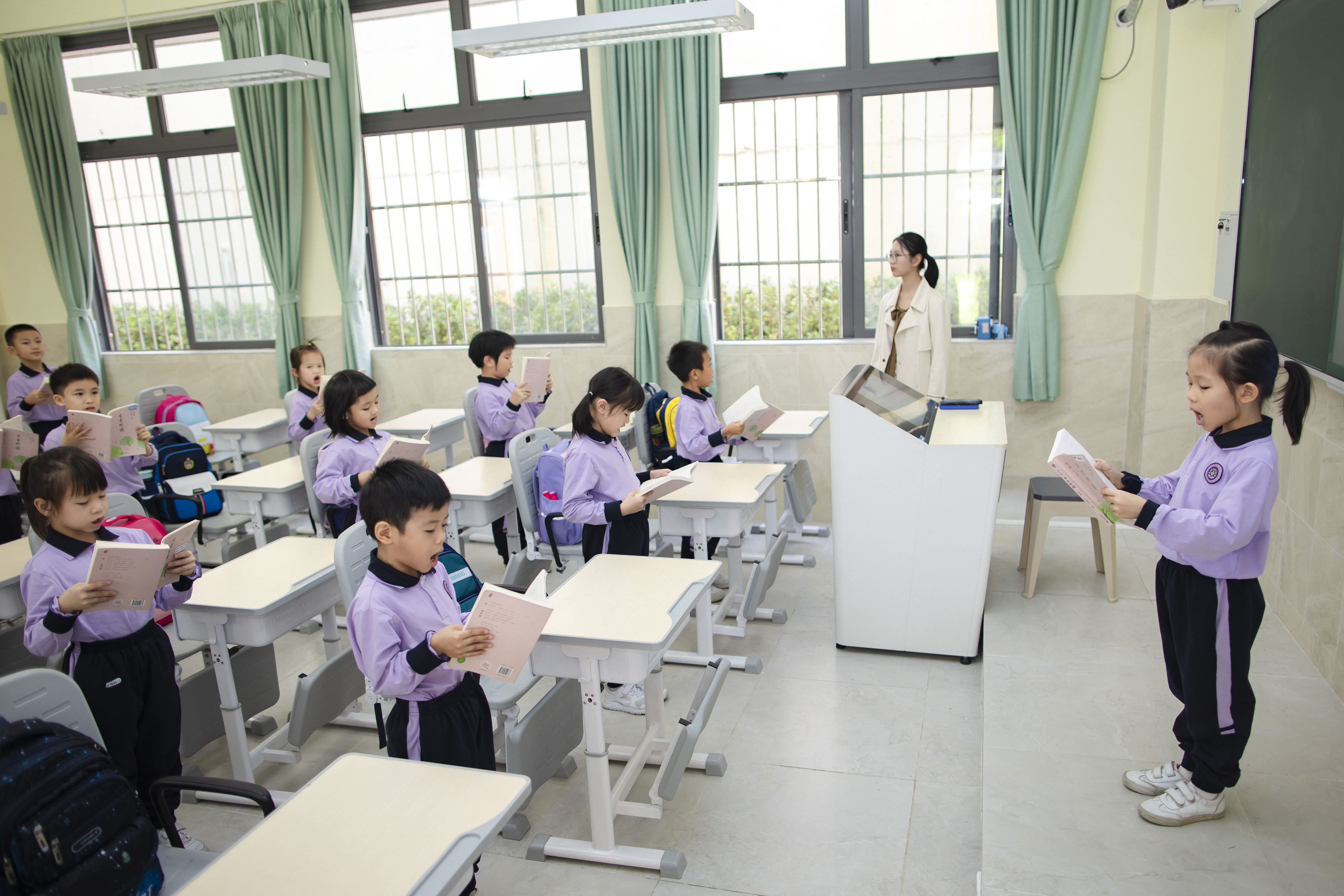 平坦开阔的操场上,一(2)班的萌娃们正在老师的带领下上着篮球课。与此同时,一(1)班的音乐课、二(1)的语文课、三(1)班的书法课……也在多个课室同步开展着。教室窗明几净,身着浅紫色校服的同学们,或聚精会神听讲,或热火朝天讨论,薄荷绿色的窗帘更增几分生机。据了解,尽管首年开学只有68位创校生,学校同样为同学们配齐配足师资和课程。