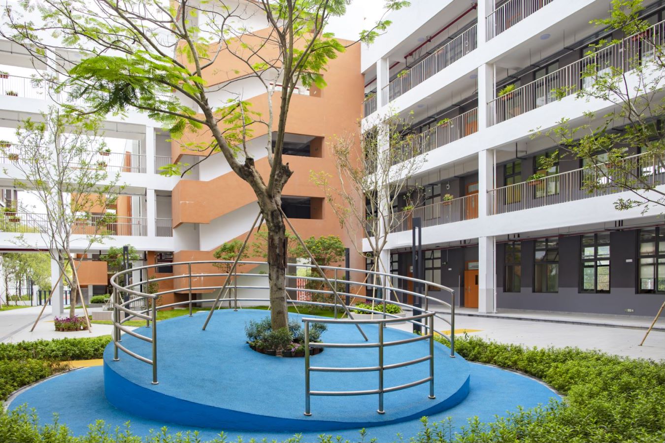10月一个晴朗秋日上午,记者走进长岭居小学北校区。校园建筑墙面橙白相间,校门口“年轻”的凤凰树正迎着朝阳奋力生长,颇有赏心悦目之感。沿着主校道拾级而上,便来到了校园的核心区域。