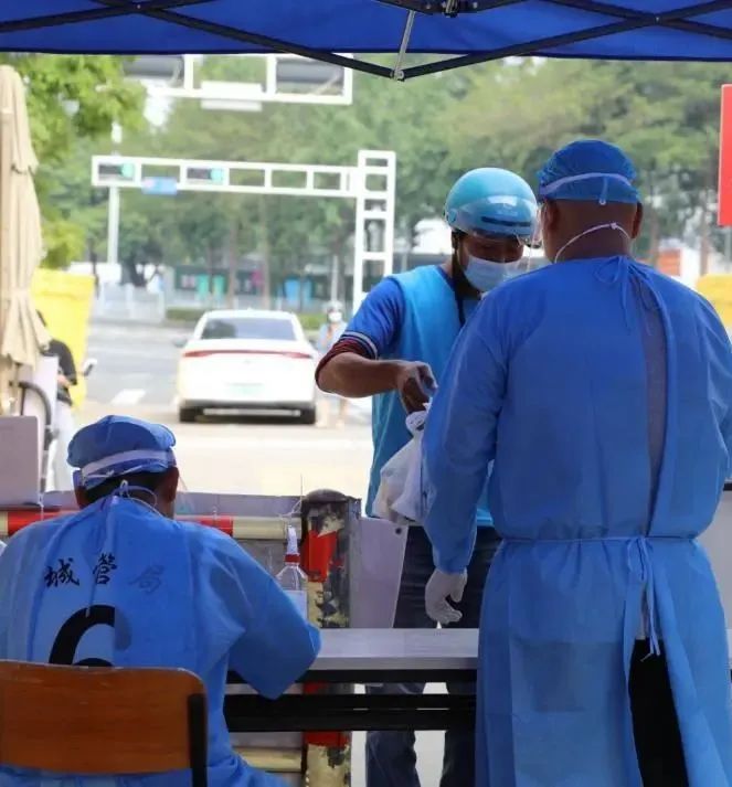 在沙头街横江村,有一支由200多位村民组成的“家园护卫队”。横江村实施管控的第一天,村内全员需要开展核酸检测,为配合工作,横江村“家园护卫队” 的队员们一起出谋划策,分工合作:有建筑经验的村民负责核酸采样点的搭建;身为医生的村民负责协助开展核酸采样;不少村民搬来了自家的帐篷和风扇;还有村里的商贩开着小三轮车负责运送物资……当天不到一个小时,村里就搭建好多个采样点。