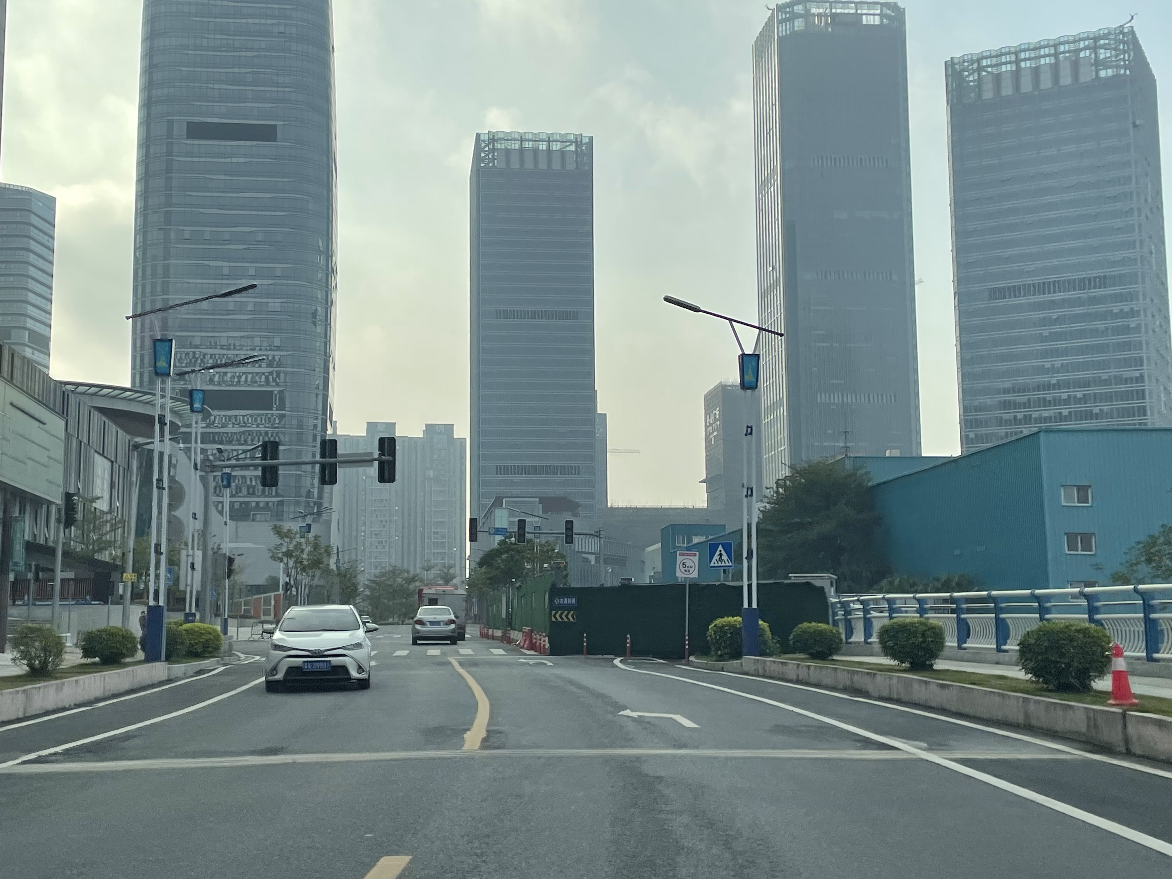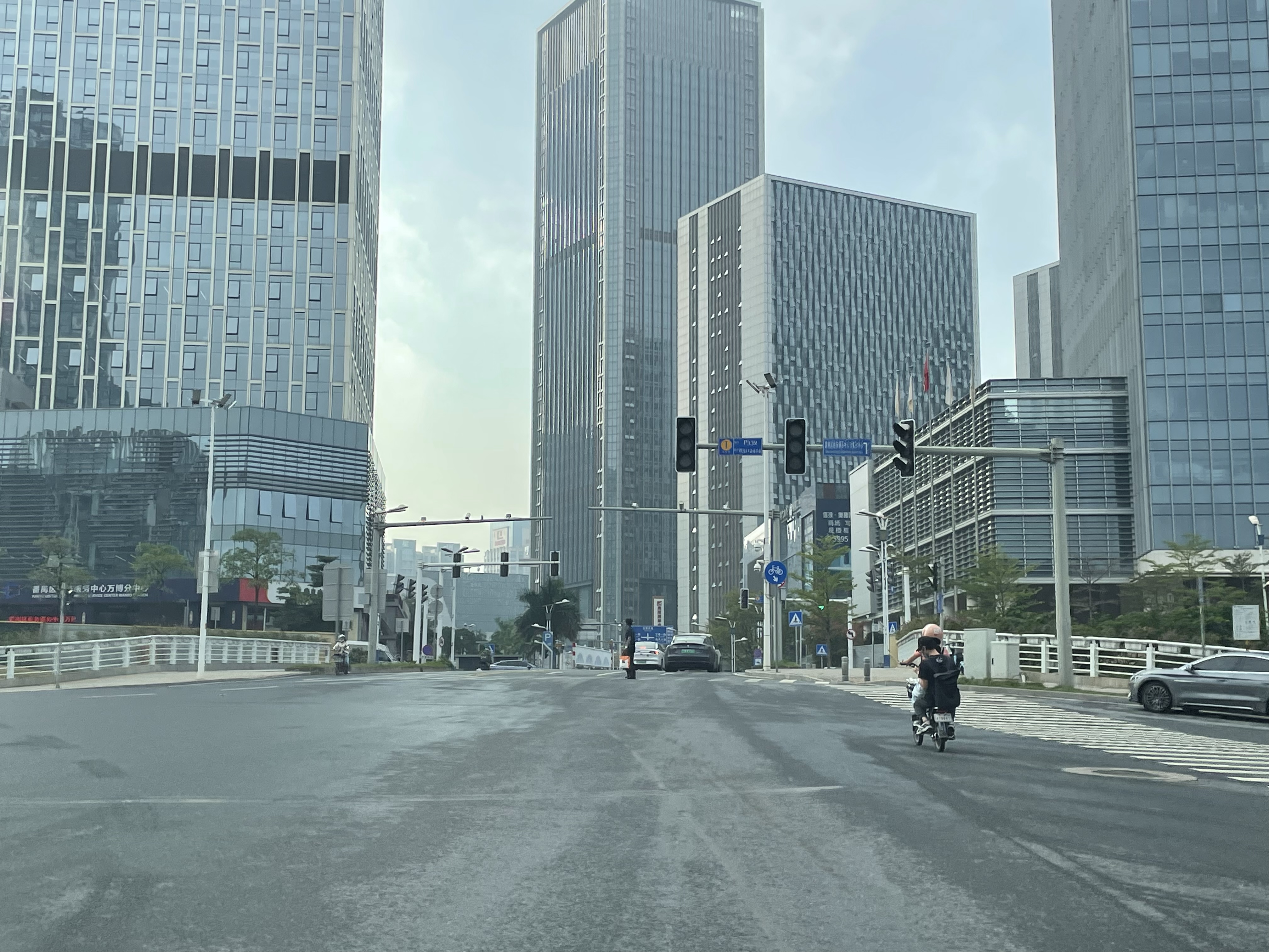 早上8:00,兴南大道往广州方向车辆较多,但通行依旧通畅。万博商圈内车流畅依然较少 ,行人骑电动车上班。