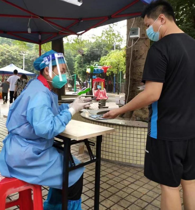 李倚清是西山村某门诊护士,有一次,她去排队做核酸时,发现采样医护人手不足,且做检测核酸的街坊越来越多,为减缓现场医护压力,她放弃休息时间,即刻换装上场。