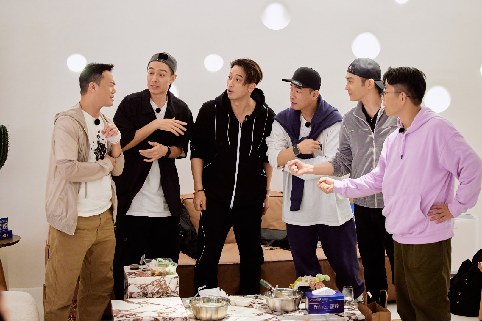 虽然做的是简单小吃,但是工序丝毫马虎不得。过程中,因为水迟迟不开,被迫出现让食客多等的状况,尽管只耽误客人5分钟,张智霖也立刻提出“不如我们唱一首歌来补偿大家”。随后,一首经典粤语歌《万水千山总是情》被大湾仔们深情演绎,动情的歌声和应景的歌词,让观众喝彩、掌声不断,还生出了意外之喜——两桌本是陌生人的食客,为听歌而拼桌,随后熟稔交谈起来,颇有相逢恨晚之情。食客们对林晓峰表示:“因为你们,我们团聚在一起。”共情力超强的林晓峰也立刻回应道:“我们大湾仔也是因为你们聚在一起。现在大家全部团结在这里。”