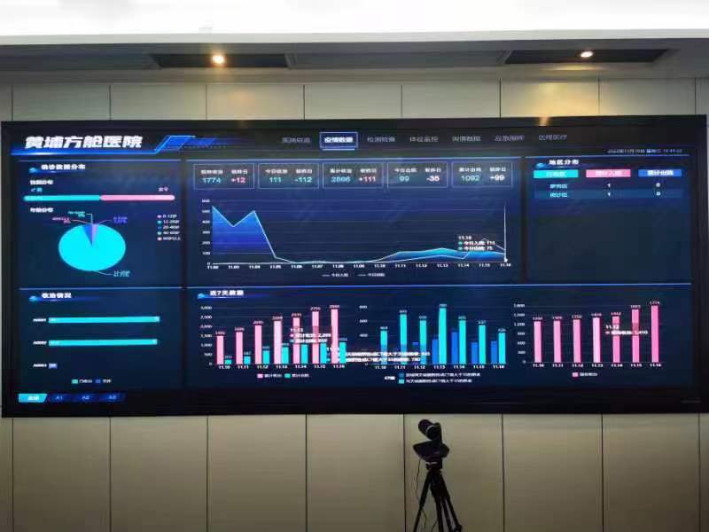 在院内抗疫数据平台驾驶舱,屏幕实时显示黄埔方舱、岭南医院等分院区隔离病房收治数据