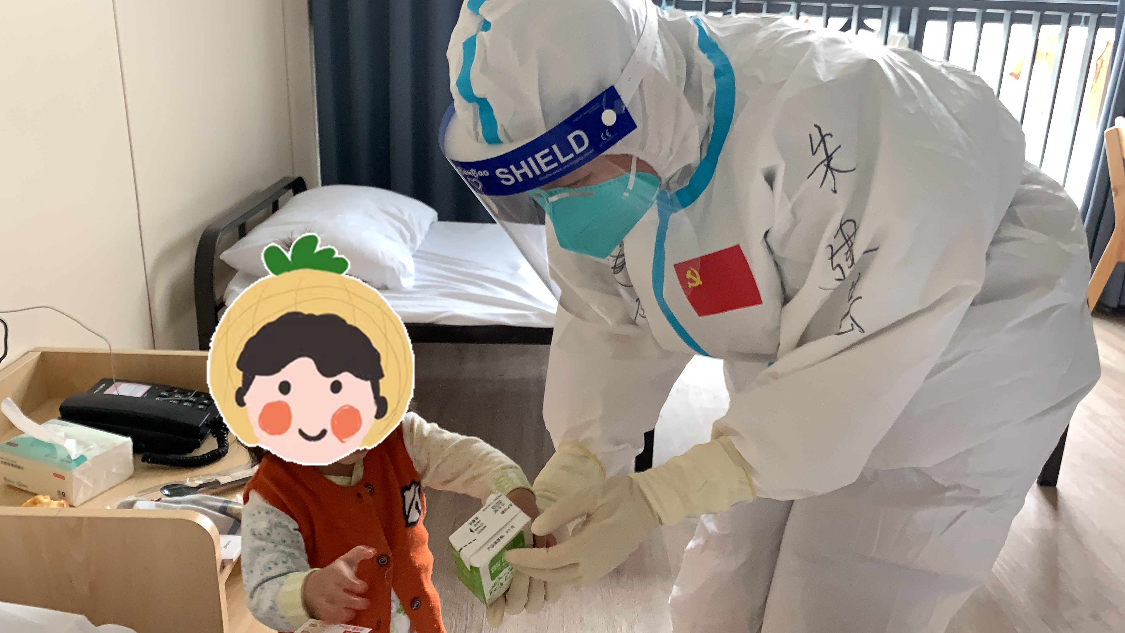 广州市黄埔方舱医院内,中山大学附属第三医院查房医生给小患者赠送牛奶