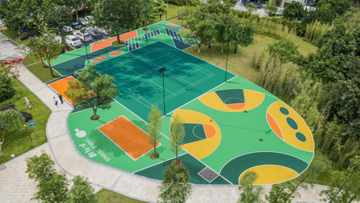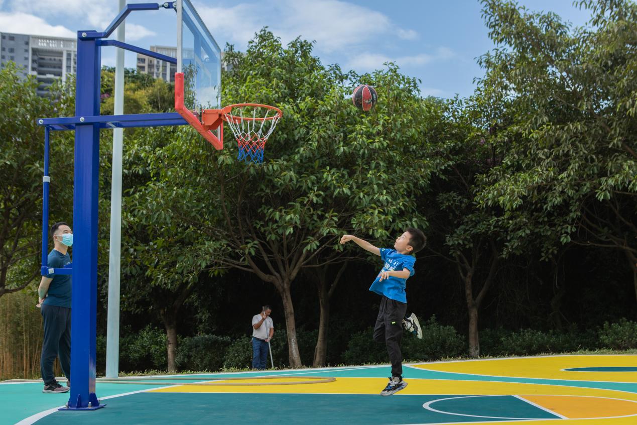 为此,公园出入口周边区域特地建设了集文化舞台、篮球场、足球场、乒乓球场、足球场、健身器材等为一体、占地2800余平方米的体育文化广场。其中,设有羽毛球场2个、儿童篮球场1个、乒乓球桌2个、5人足球场1个以及云梯、单杠、秋千和组合型体育设施。与此同时,体育文化广场充分考虑人性化需求,配备AED除颤仪、直饮水机、装配式淋浴间、储物柜、售卖柜、安全警示牌牌等配套设施。