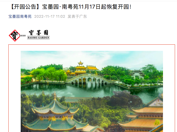 其中,宝墨园和南粤苑景区于11月17日起恢复开园,正常对外营业。宝墨园、南粤苑室外景区正常对外开放,室内各大展馆继续临时闭馆,恢复开馆时间另行通知。宝墨园内所有餐厅从即日起恢复堂食服务,大堂不同餐桌间顾客就座后最小距离不小于1米,每桌不超过10人。按照“预约、限流、错峰”等要求,落实落细常态化防控措施,游客进景区需持有48小时核酸检测阴性报告,出示健康码(绿码)、扫场所码、测体温方可进入景区。