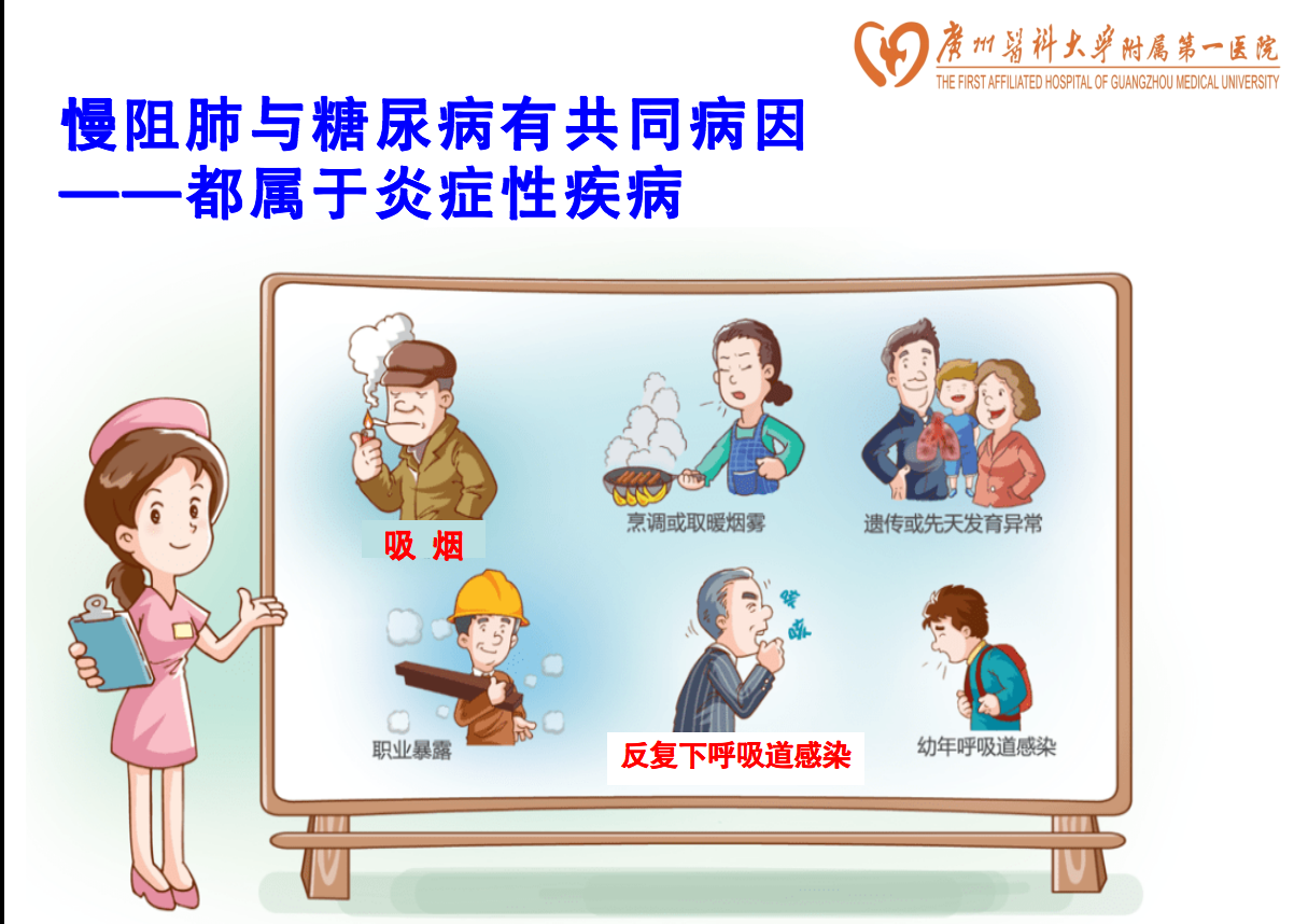 她分析说,抽烟和反复的下呼吸道感染是慢阻肺的危险因素,都可能促进胰岛素抵抗、加重胰岛负担,而胰岛素抵抗又是2型糖尿病发病的重要原因。另外,烟草里面的尼古丁可直接损伤胰岛细胞,这也是长期吸烟人群易致慢阻肺和糖尿病的共同危险因素。特别需要注意的是,由于病情需要长期使用糖皮质激素(比如泼尼松),就像这个老奶奶,虽然过去没有糖尿病,也会成为糖尿病的高风险人士。