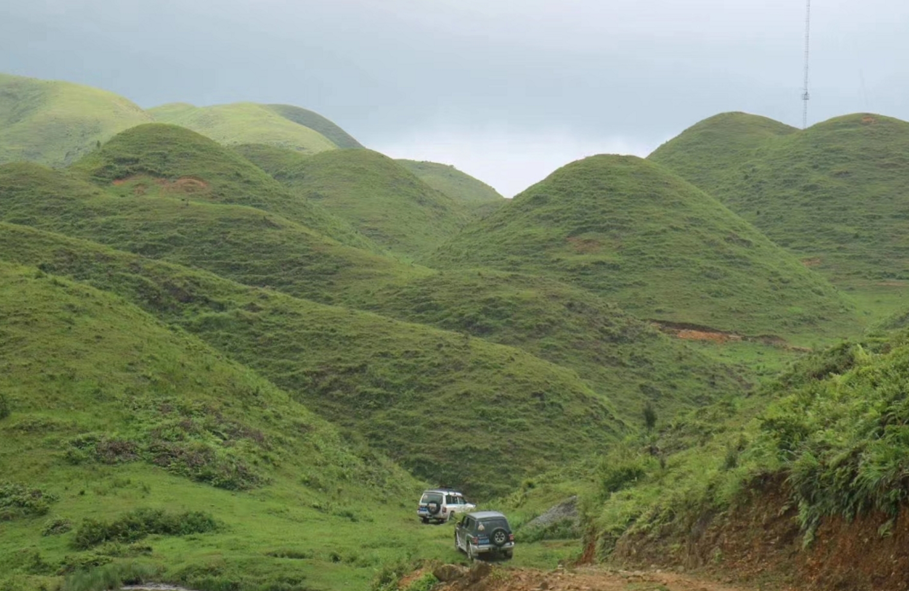 湖的左侧,山路迂回,曲径通幽。 敦敦厚厚的山包,连绵成风景独特的高山草甸。 广阔的高山草甸,野草茵茵,呈波浪形不断延绵起伏,像一块无边的绿色地毯。