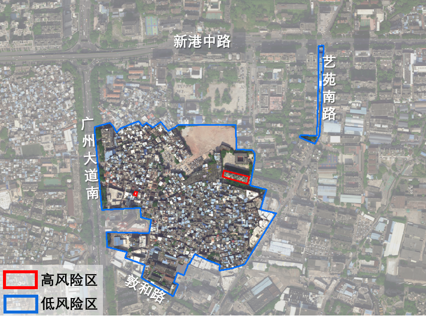 根据疫情处置进展,按照国务院应对新型冠状病毒肺炎疫情联防联控机制综合组《新型冠状病毒肺炎防控方案(第九版)》工作要求,海珠区决定自2022年11月19日24时起,将江海街道桂田、金影、江贝社区(新港中路以南,敦和路以北,广州大道南以东,艺苑南路以西)(除桂田南约三巷1号、金影花园D栋外),赤岗街道艺苑南路由高风险区调整为低风险区,实行“个人防护、避免聚集”防控措施。