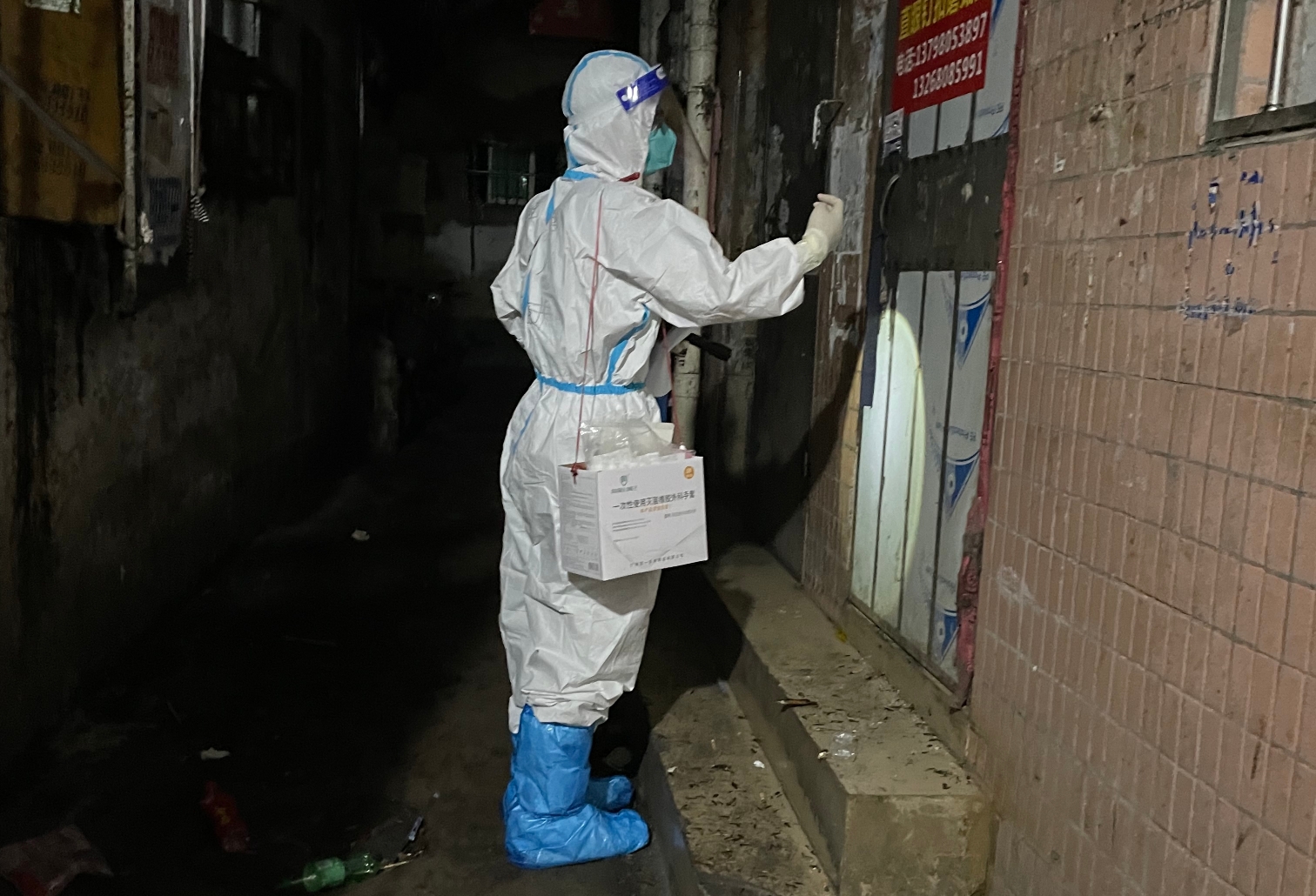 医护人员和志愿者上门为居民进行核酸检测。