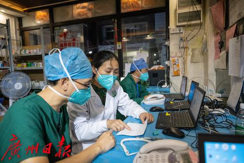 要让管控区居民安心,“做好医疗保障工作是重中之重”,在广州市疫情防控新闻发布会上,海珠区负责人这样表态。记者所见,位于南约大街的医疗救助站是整个片区最为热闹的,十多平方米的空间里,十来位医务人员正在忙碌着,左侧热线区四台电话铃声此起彼伏,24小时都有多名医务人员接听;右侧的诊疗区,医生埋头写处方做分析,护士根据处方在配药。门外,三辆救护车随时候命,旁边还停着几辆电动车、小型电瓶车。“城中村里街巷狭窄,我们借来电动车,由专人带路,加快上门送医送药的速度,一旦有紧急情况,就用担架推车转运病人。”医疗救助站负责人、海珠区妇幼保健院副书记李玉红说。