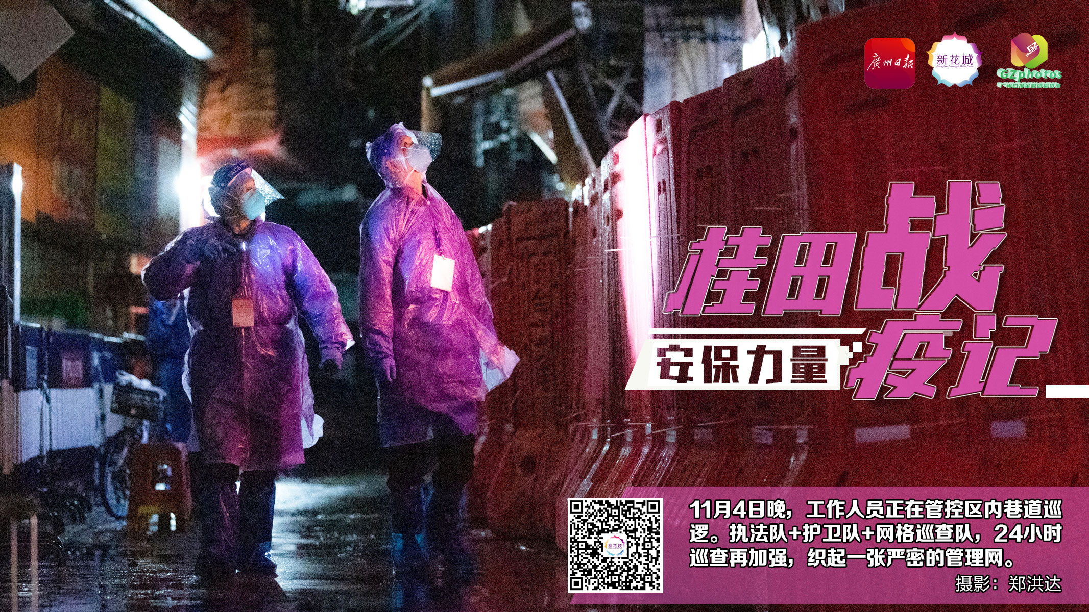 “房东”护村队上岗通宵巡逻的背后,桂田片区全力做好疫情防控管理,执法队+护村队+网格巡查队,24小时巡查再加强,织密一张严密的管理网:海珠区144名安保力量组成执法队伍,加上由核酸检测一直阴性的社员组成了桂田、江贝、旧市头村三支共73人的护村队,负责夜间村里的巡逻,劝阻居民随意出户。