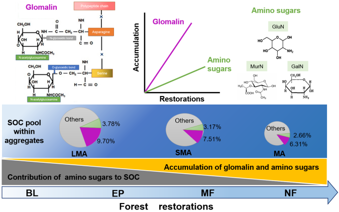 研究发现,裸地造林大大增加了球囊霉素相关蛋白和氨基糖在土壤中的积累,但降低了它们对土壤有机碳库的贡献。研究团队表示,恢复过程中球囊霉素相关蛋白比氨基糖积累更快,对土壤有机碳库的贡献更大。这表明森林恢复过程中,丛枝菌根真菌在调节土壤碳循环方面发挥着重要作用。丛枝菌根真菌植物的引入,可以作为一种有效的恢复策略,来促进土壤有机碳的固持。