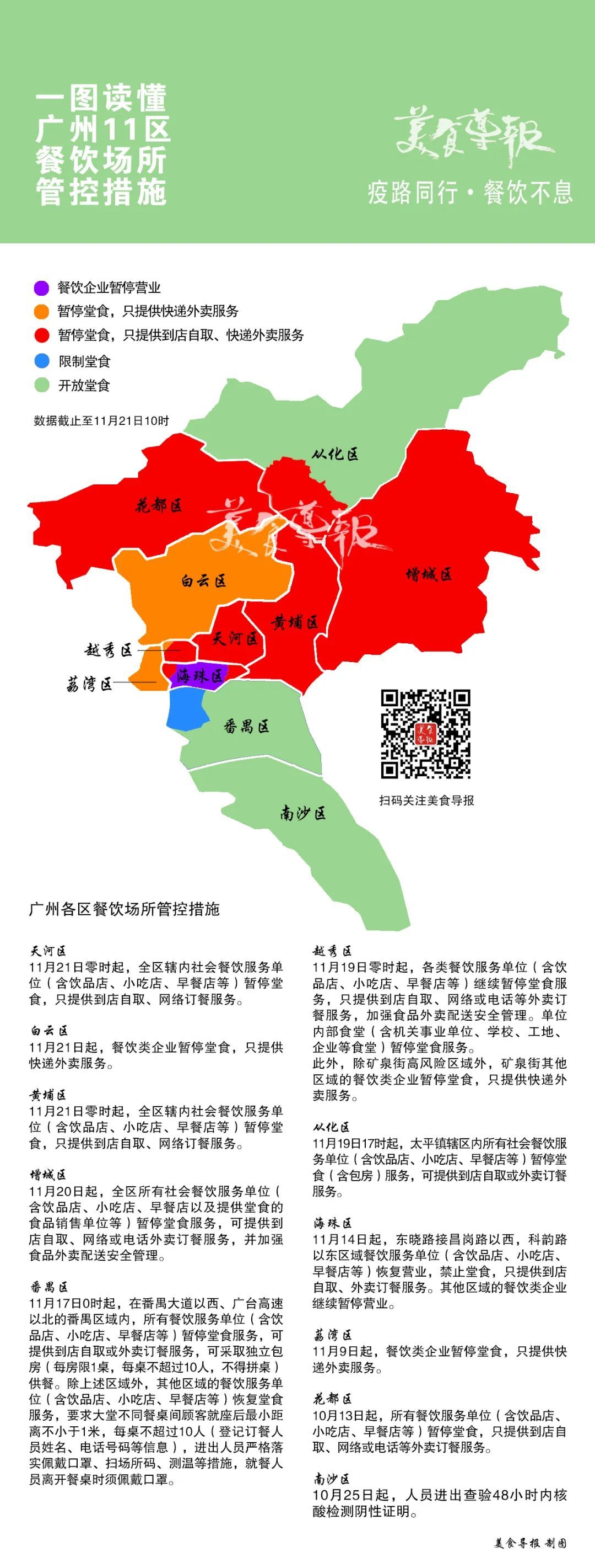 其中,黄埔区要求,11月21日零时起,全区辖内社会餐饮服务单位(含饮品店、小吃店、早餐店等)暂停堂食,只提供到店自取、网络订餐服务;白云区要求,11月21日起,餐饮类企业暂停堂食,只提供快递外卖服务。