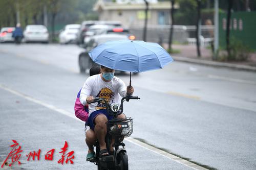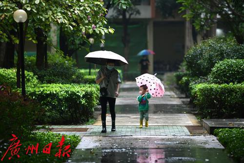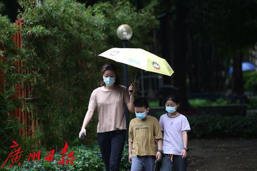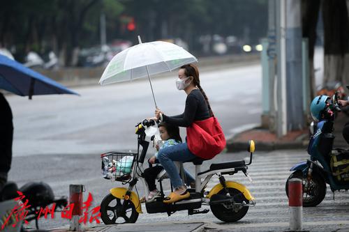 今晨的广州下起了一点小雨,一位妈妈为他的孩子在雨中撑伞出行。
