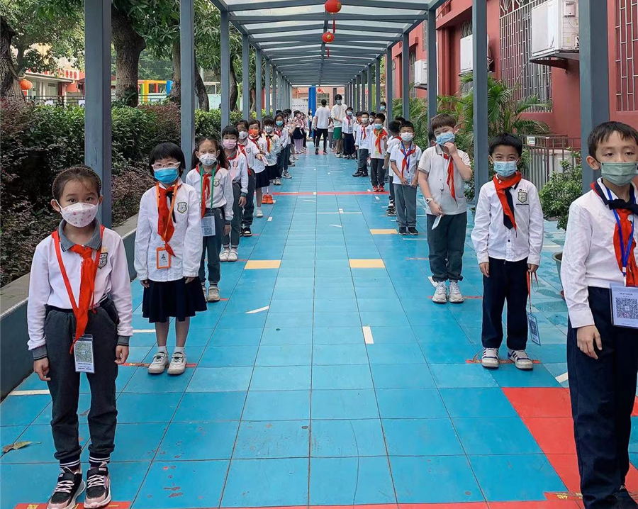 11月21日上午,番禺区钟村街正声小学,学生们在老师的引导下,间隔一米距离有序排队,戴好口罩测温后,走进课室。恢复线下教学的第一天,课室饭堂井然有序,同学们活力十足。