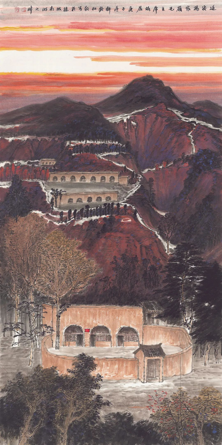 这幅作品对表现对象没有直接用“显”的方式,而是从“隐”的视角凸显毛主席故居的精神力量。中景远景为坚实巍峨的山脉,延安革命的激情被漫天红霞照耀,被宏伟的山峦层层烘托,被毛主席故居隐身的主角点燃。