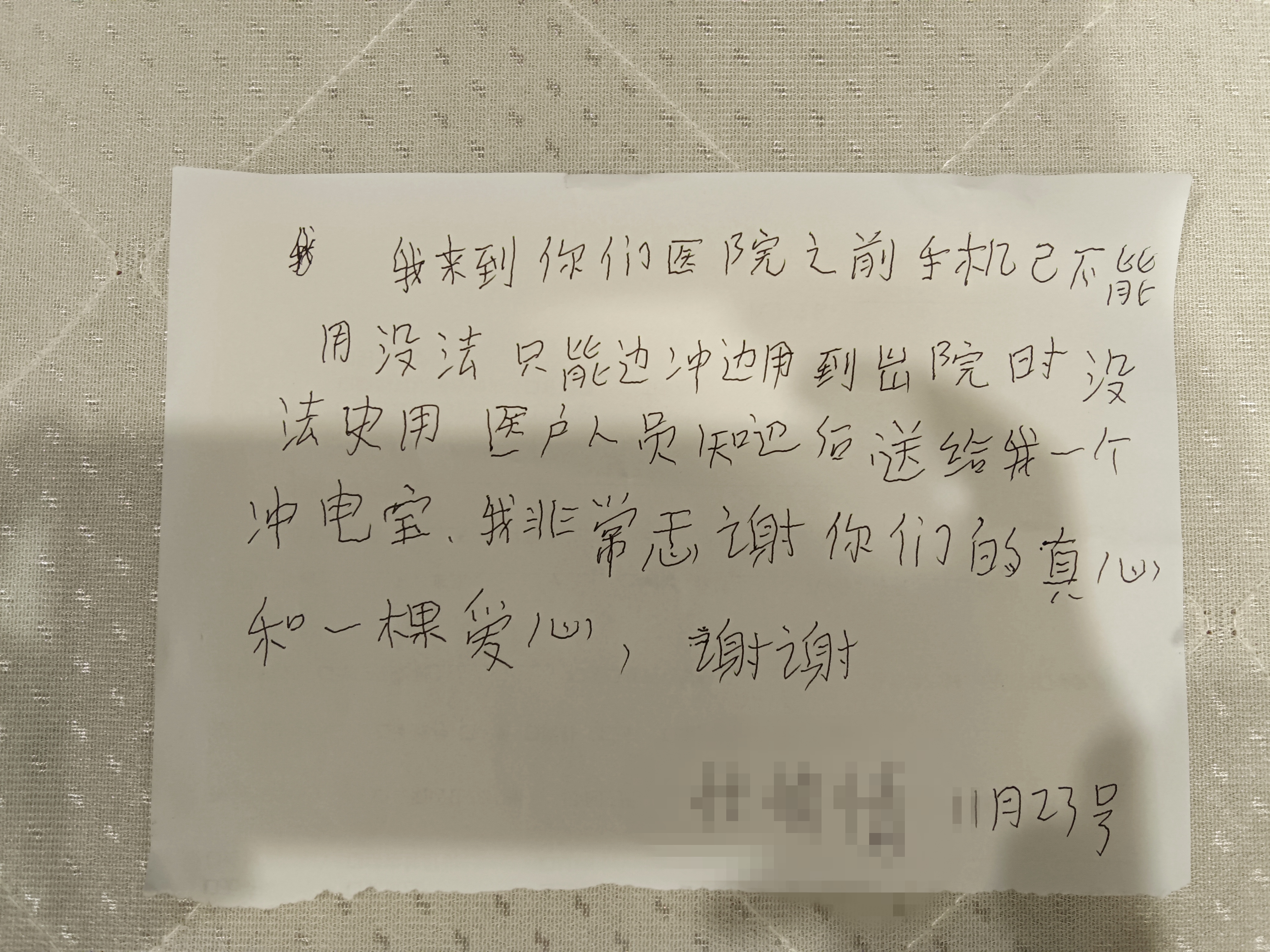 代阿姨不仅连声跟我道谢,还写下亲笔感谢信:“我来到你们医院之前手机已没法用,只能边冲(充)边用,到出院时没法史(使)用,当医护人员知道后送我一个冲(充)电宝,我非常感谢你们的真心和一棵(颗)爱心,谢谢你们!”