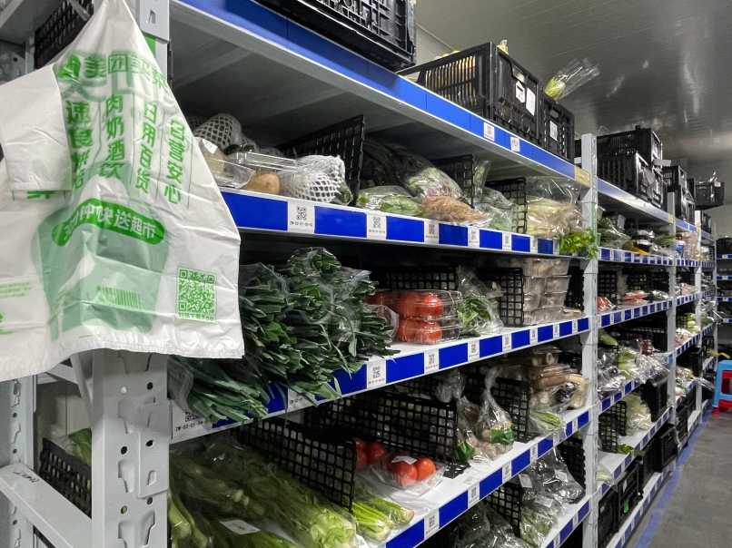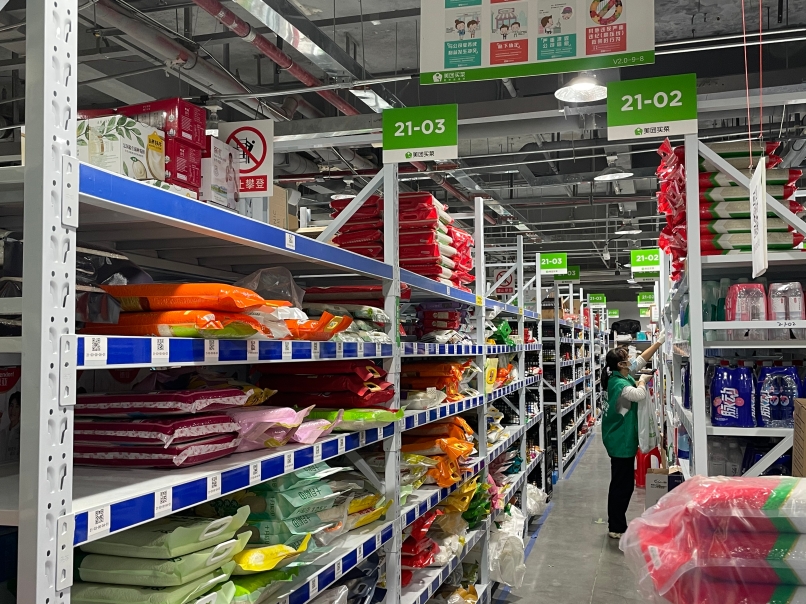 ↑美团买菜(昌岗站)分拣人员正在对照订单分拣商品