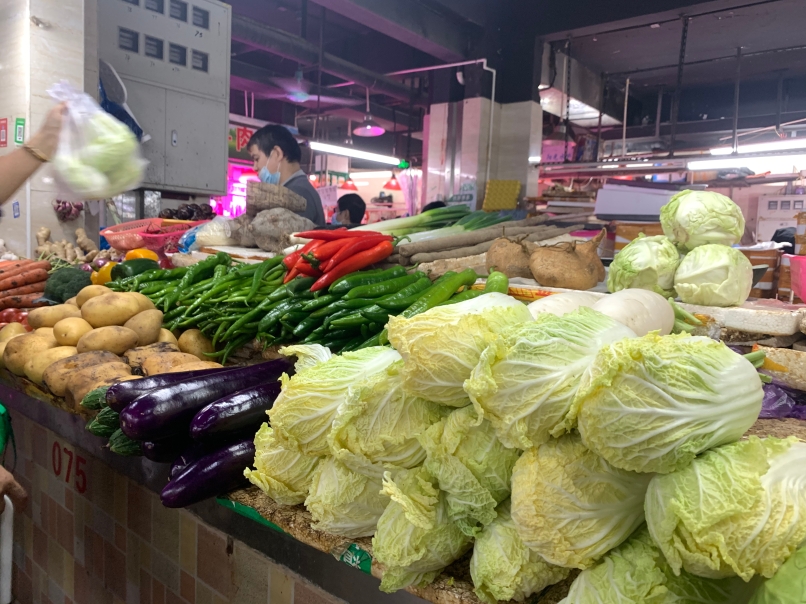 ↑荔湾区石围塘街道兴东路的桥东市场下午4时许部分摊位仍有足量蔬菜。